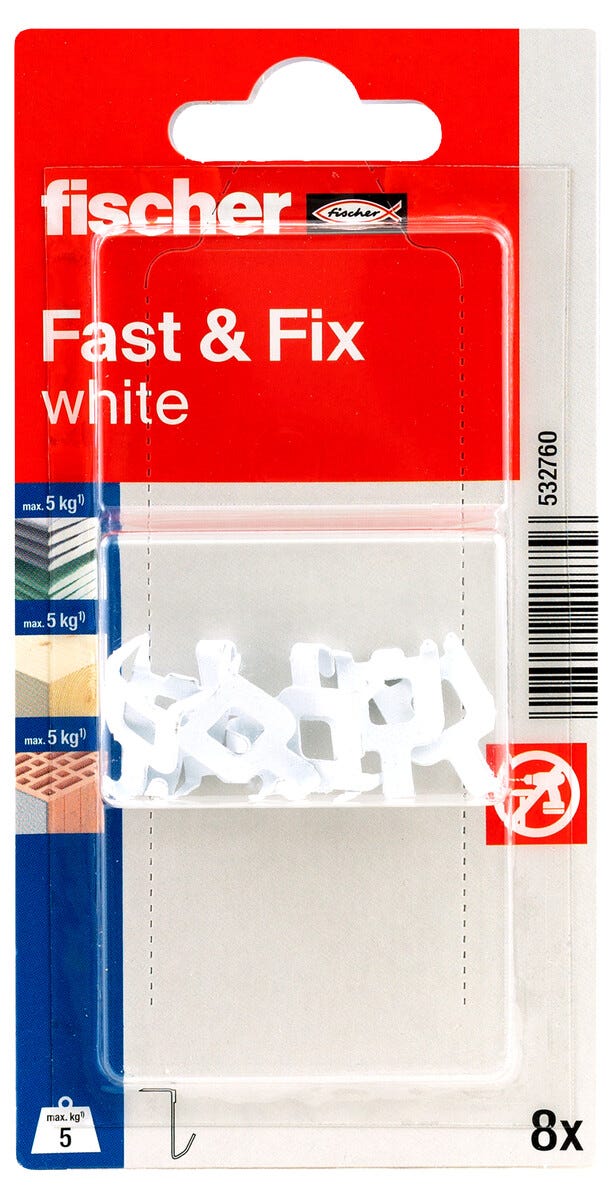Krok Fischer Fast & Fix -koukku lukittuu innovatiivisen rakenteen ansiosta seinään ja kantaa enintään 5 kg:n painon. Jos kahta koukkua käytetään yhdessä, kantokyky on enintään 10 kg.
