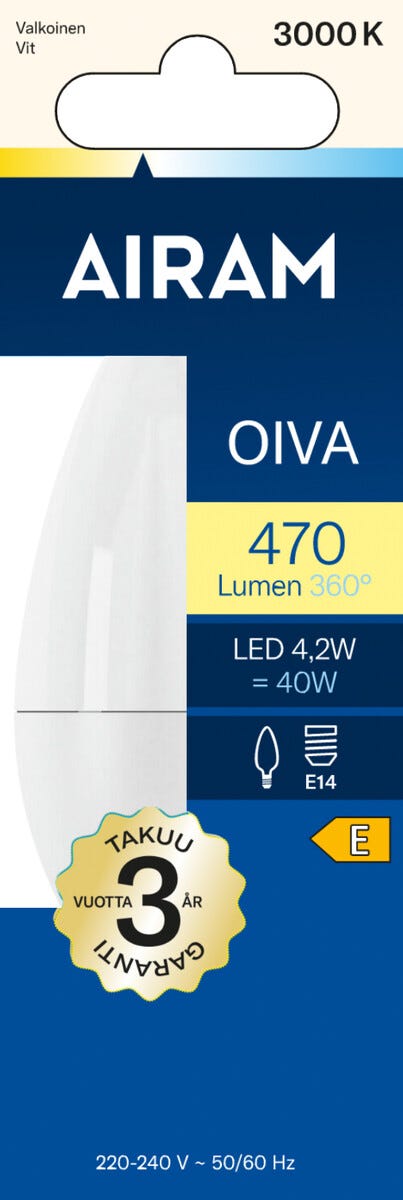 • Airam Oiva, himmennettävä LED-kynttilälamppu E14, opaalinvalkoinen lasi.