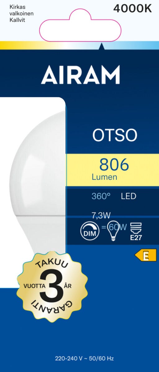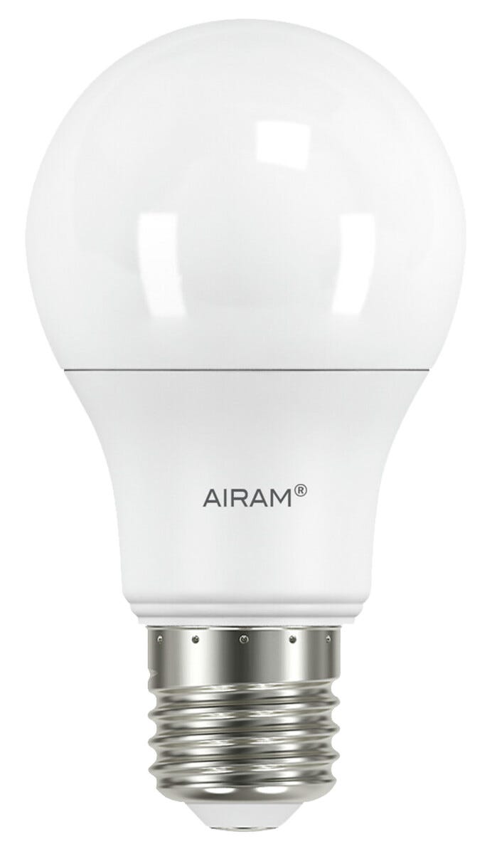 • Airam-LED-lamppu, jossa E27-kanta, häikäisemätön opaalinvalkoinen lasi.