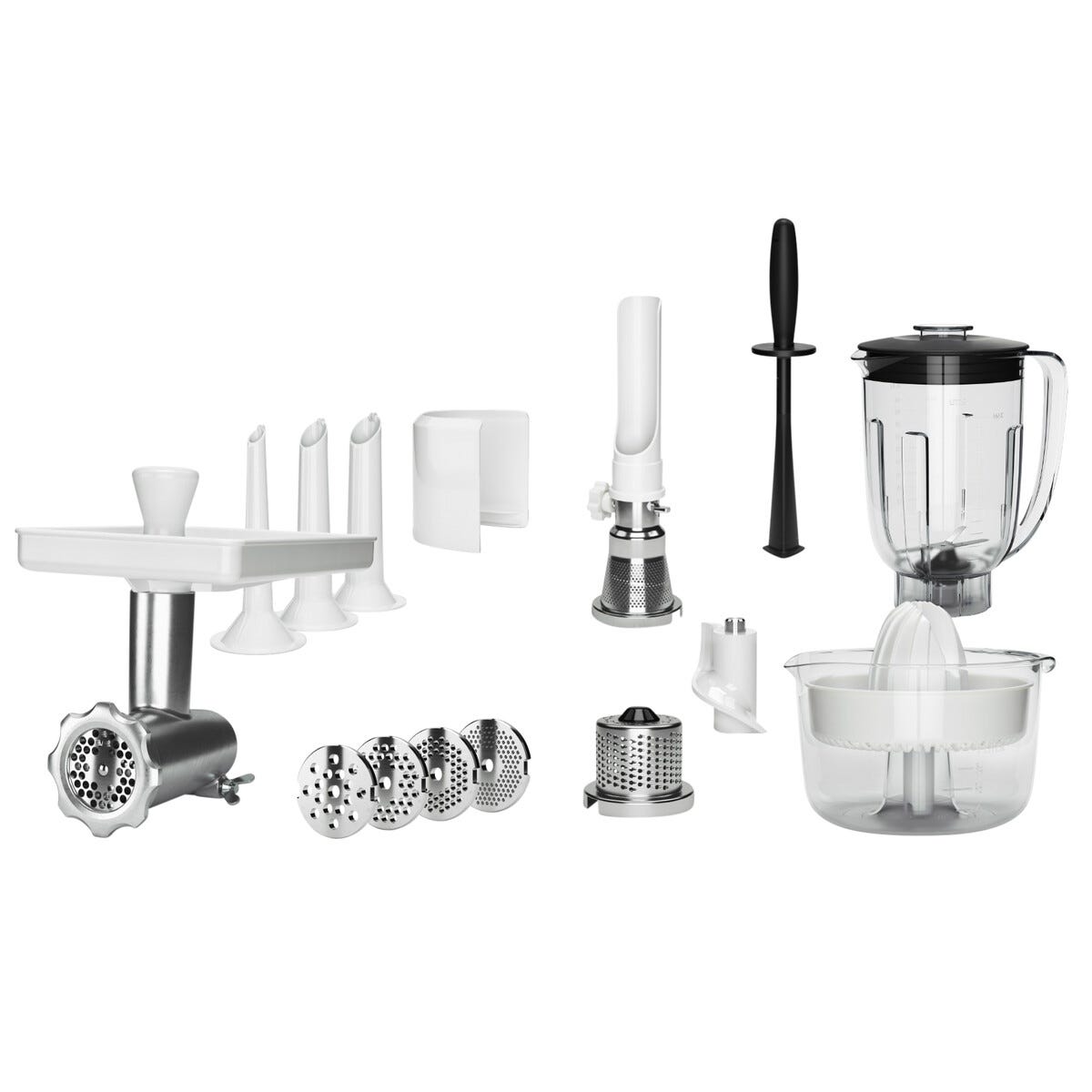 • Lihamylly, marja- ja hedelmäpuserrin, tehosekoitin ja painin, sitruspuristin ja raastinsarja.
