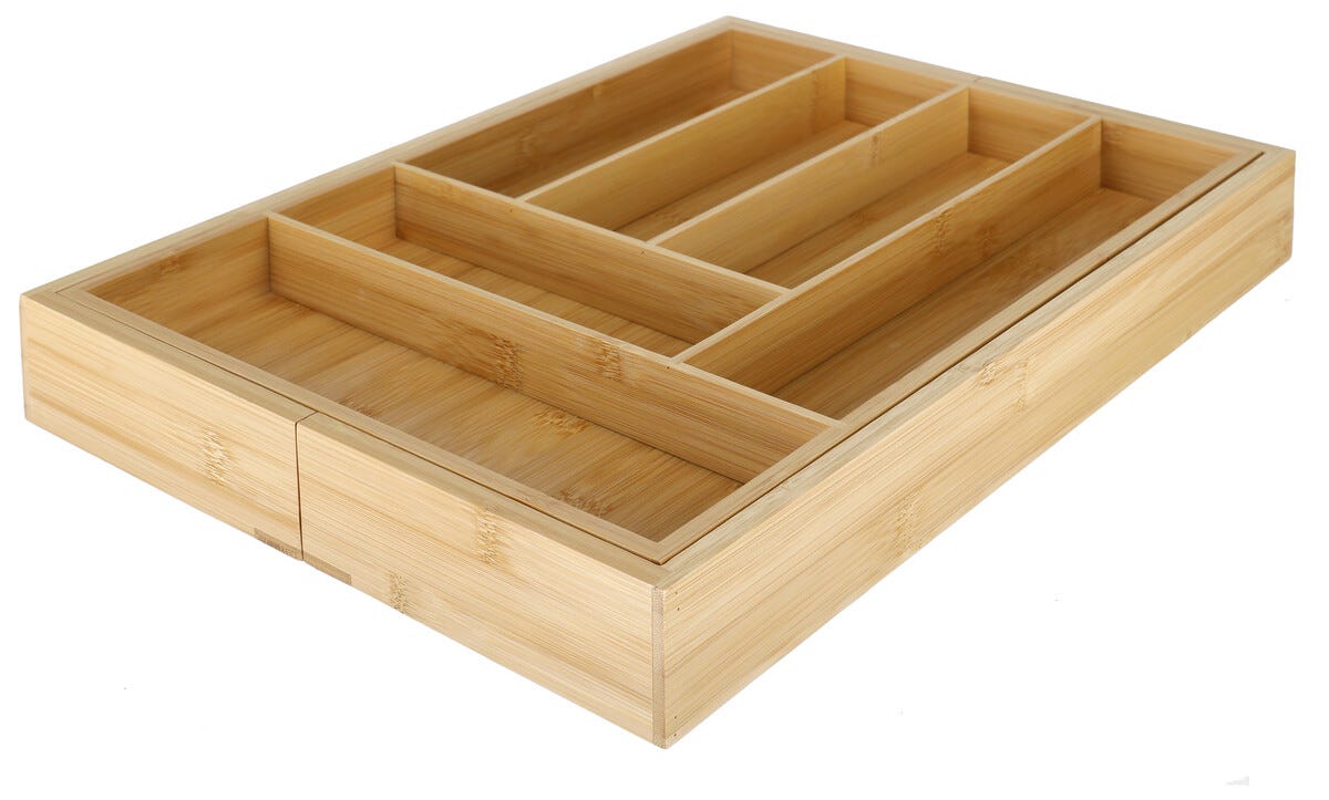 • Bambusta valmistettu säilytysratkaisu – pitää haarukat, veitset, lusikat ja tarvikkeet järjestyksessä.