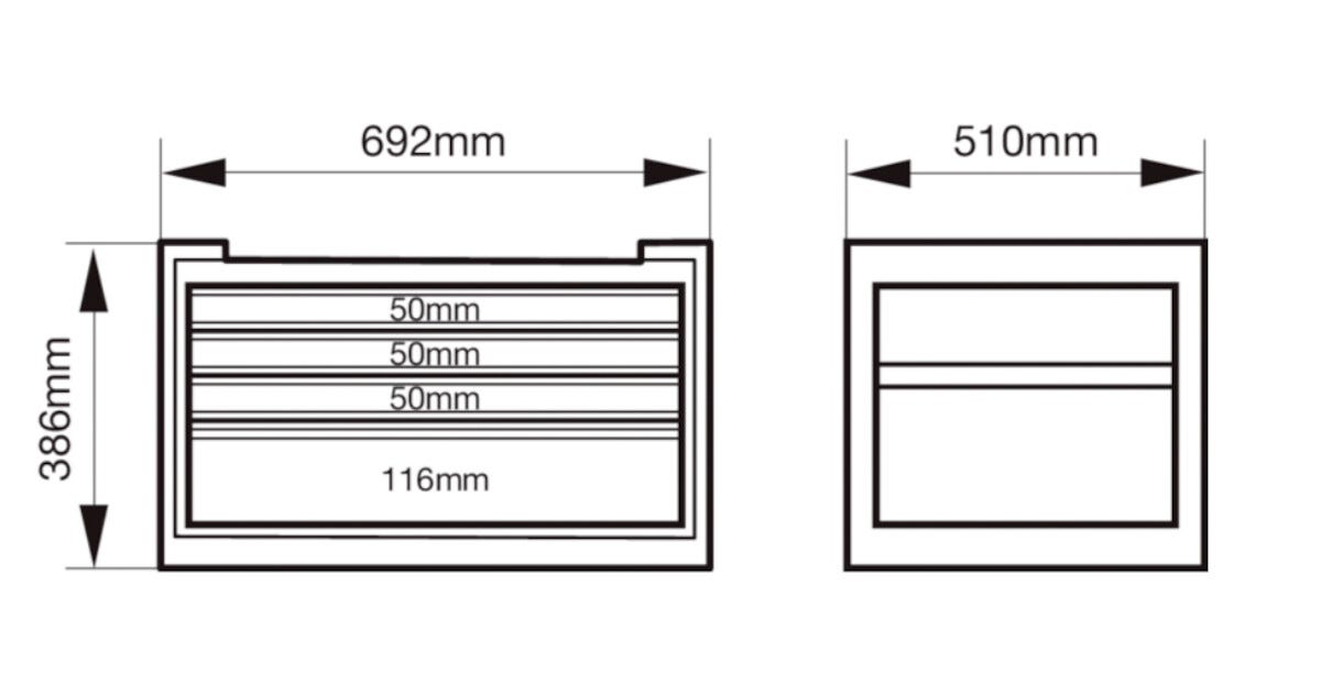 • 4 täysin avattavaa laatikkoa, joissa on kuulalaakeroidut kiskot – helppo vetää ulos.