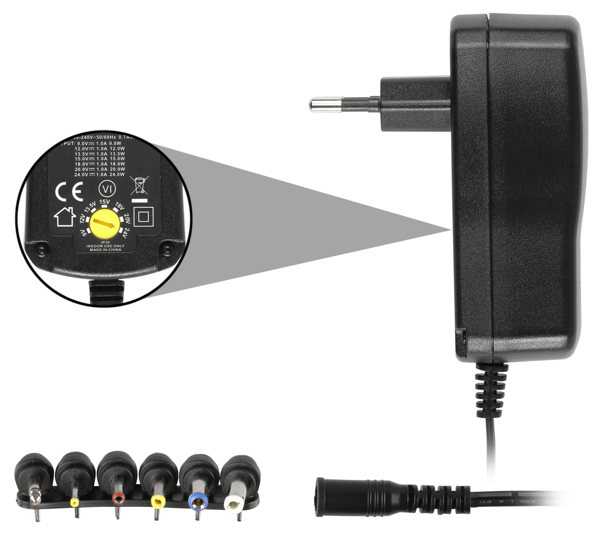 • Säädettävä jännite ja vaihdettavat DC-liittimet – sopii moniin eri laitteisiin.