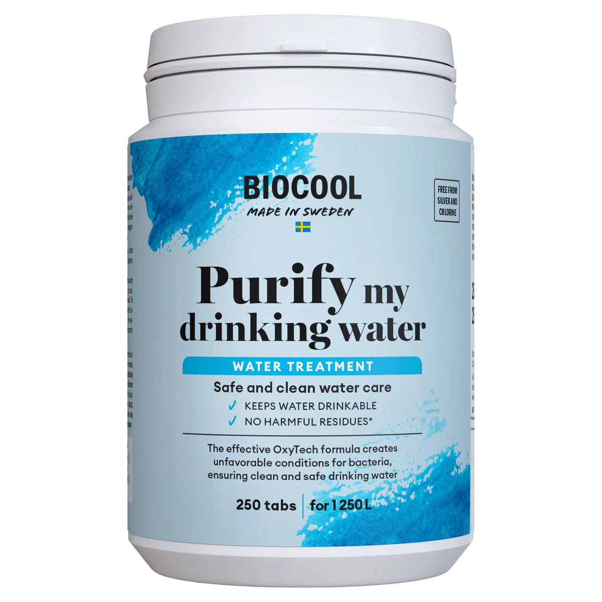 • Tabletter utan klor, silver eller restkemikalier – 250 tabletter renar 1250 liter dricksvatten.