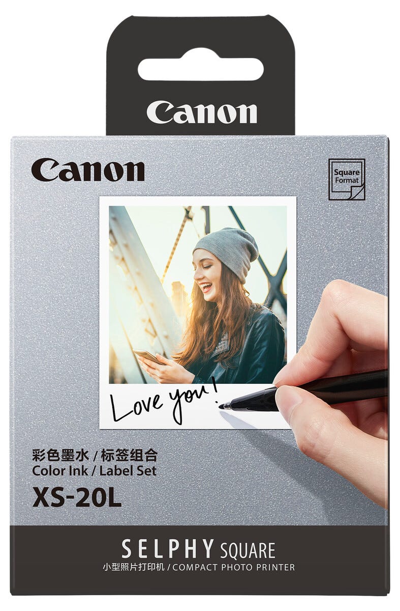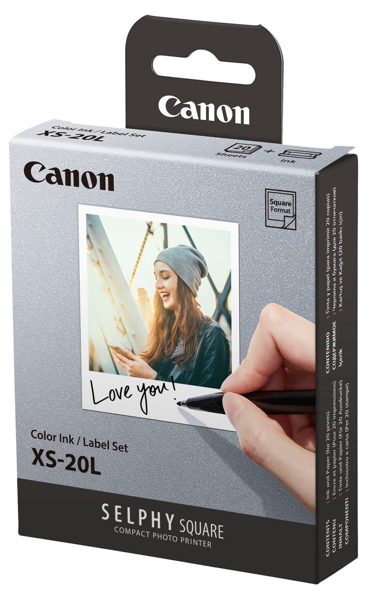 • Canon XS-20L – muste ja valokuvapaperi 20 tulosteelle (72 x 85 mm).