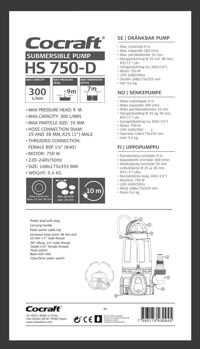 Cocraft HS 750-D Uppopumppu kelluntakytkin, sähkökäyttöinen