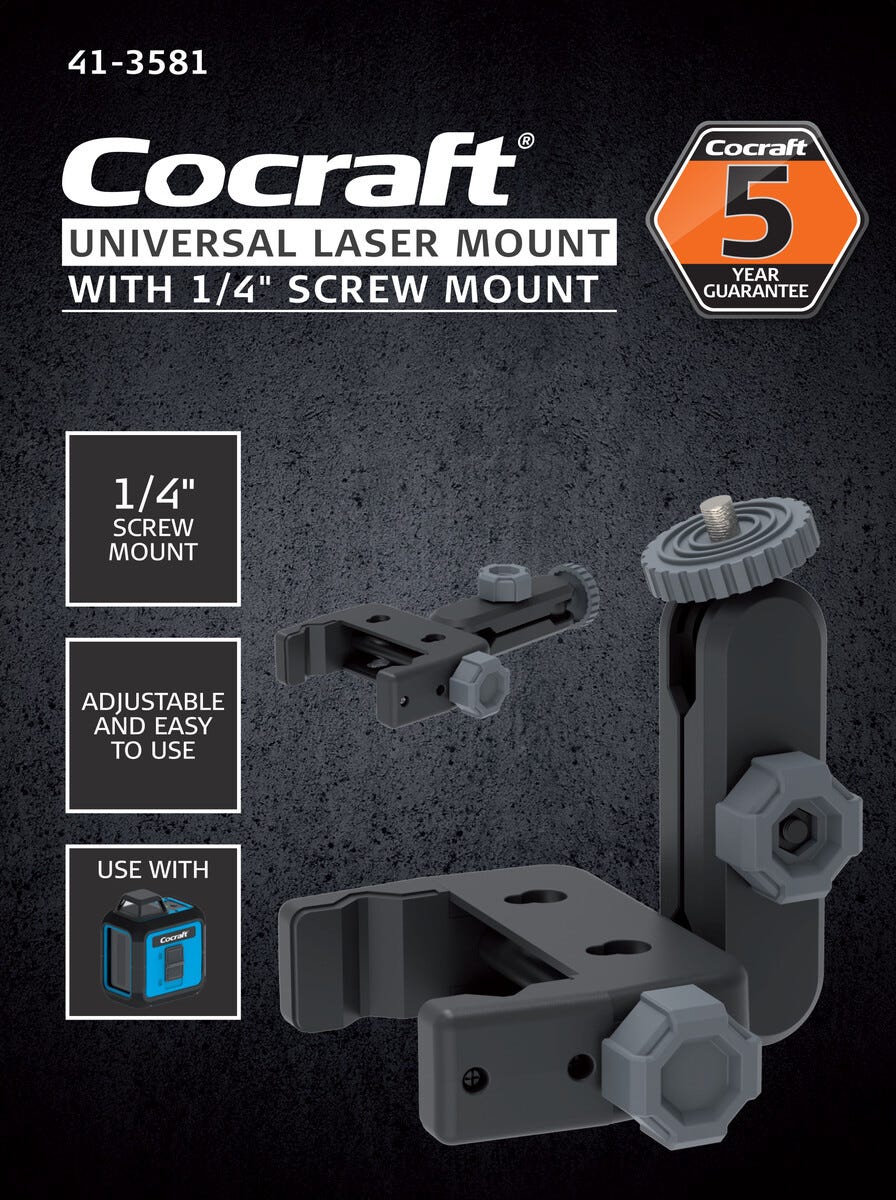 • Helposti sijoitettava kiinnike ristilinjalaserille, jossa on 1/4 tuuman ruuvikiinnitys.