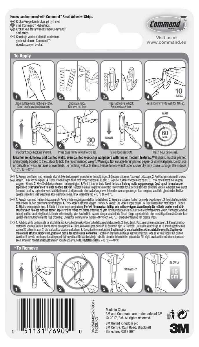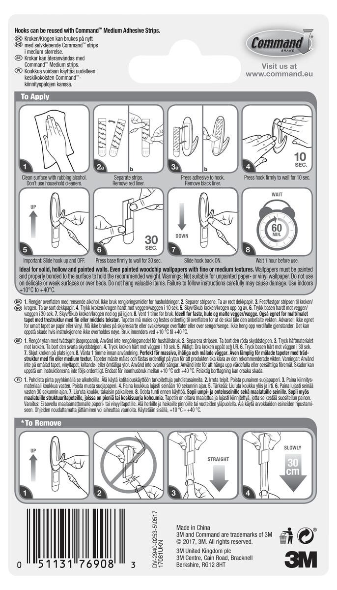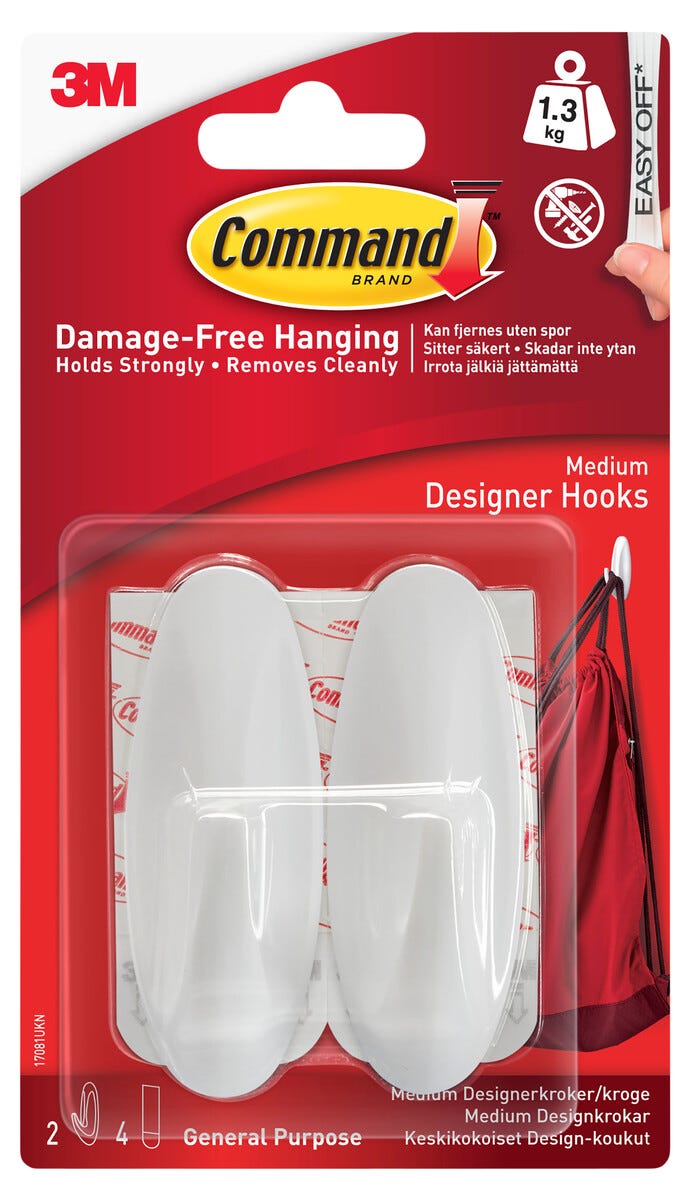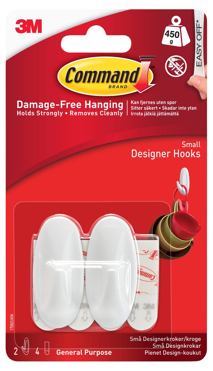 • Command-seinäkoukut – pysyvät tukevasti kiinni eivätkä vahingoita kiinnityspintaa.