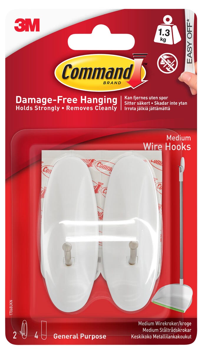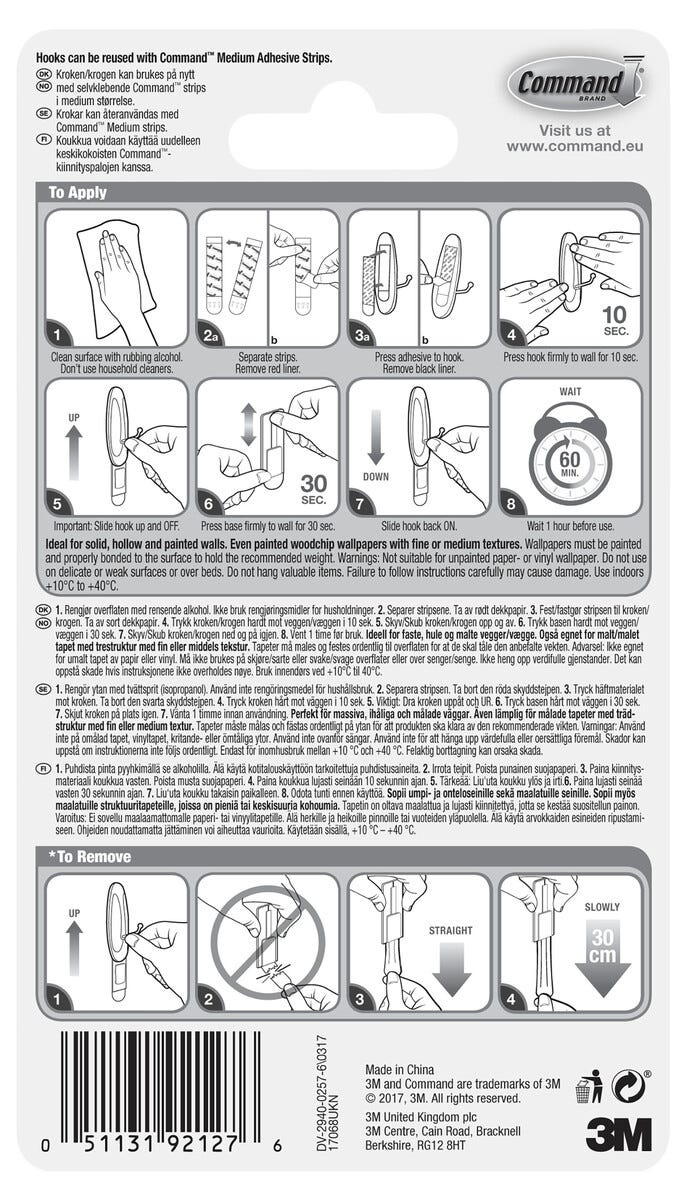 • Command-metallilankakoukut – pysyvät tukevasti kiinni eivätkä vahingoita kiinnityspintaa.