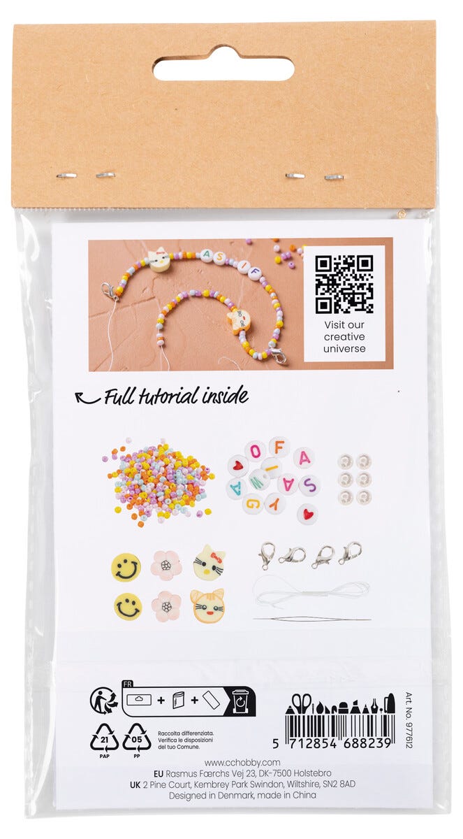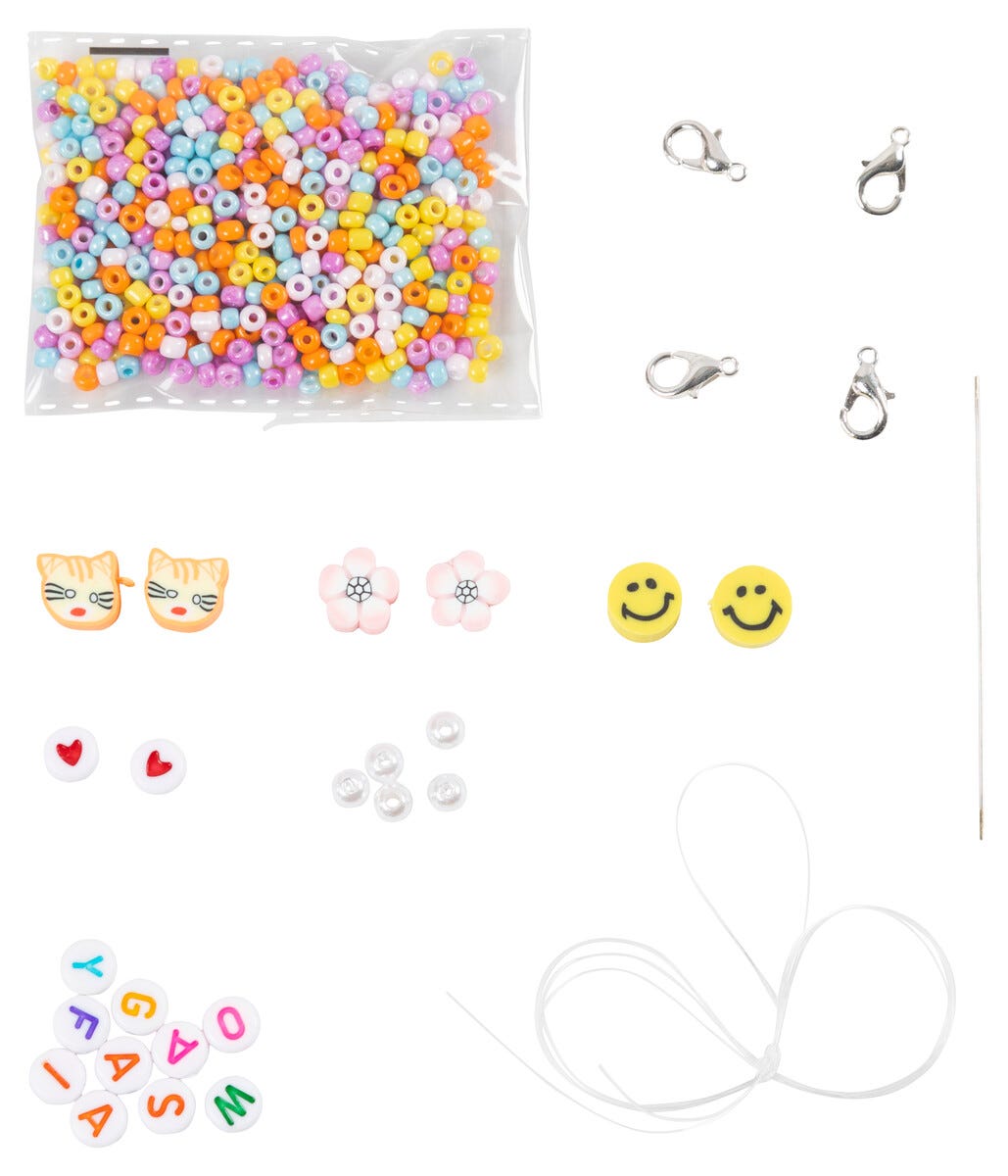 • Sisältö: Muotoiltuja puuhelmiä, kirjainhelmiä, rocaille-helmiä, nyöriä, jousihakoja ja helmineula.