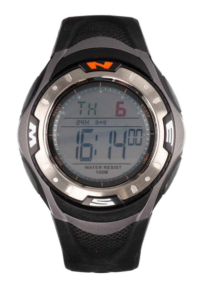 Vesitiiviys 10 ATM, kestää uinnin ja snorklaamisen. Taustavalaistu näyttö, jolla kellonaika, päivämäärä, kaksi aikavyöhykettä, herätys, aikamerkki, lähtölaskenta-ajastin ja sekuntikello väliajoilla. 12 ja 24 tunnin näyttö. Ø 46 mm. Muovinen ranneke. Mukana paristo CR2025.