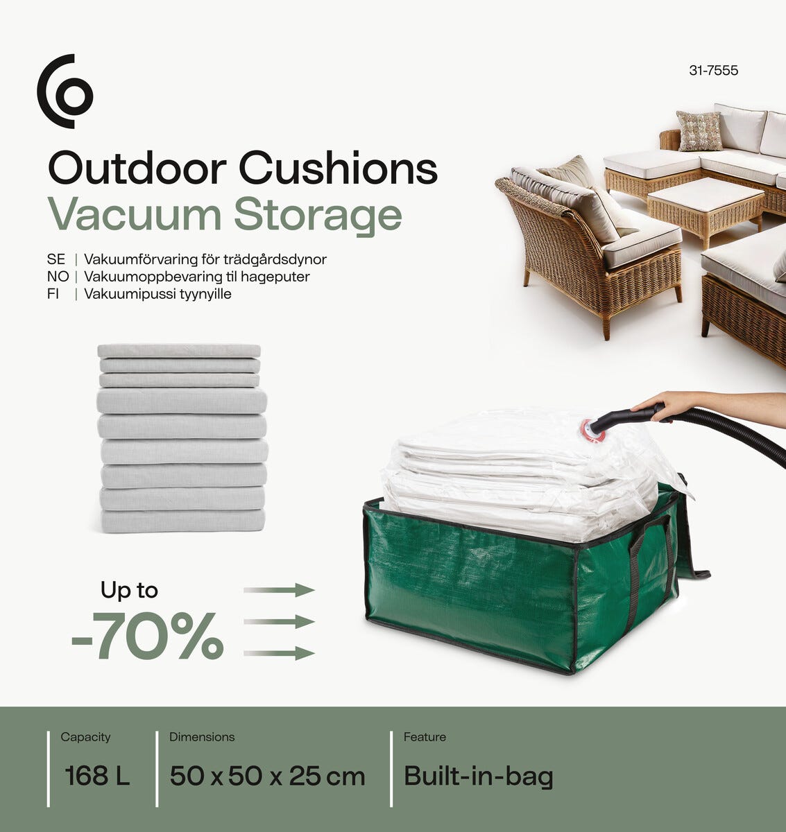 • Platssmart förvaring av sittdynor, utekuddar, fällar och mycket mera.