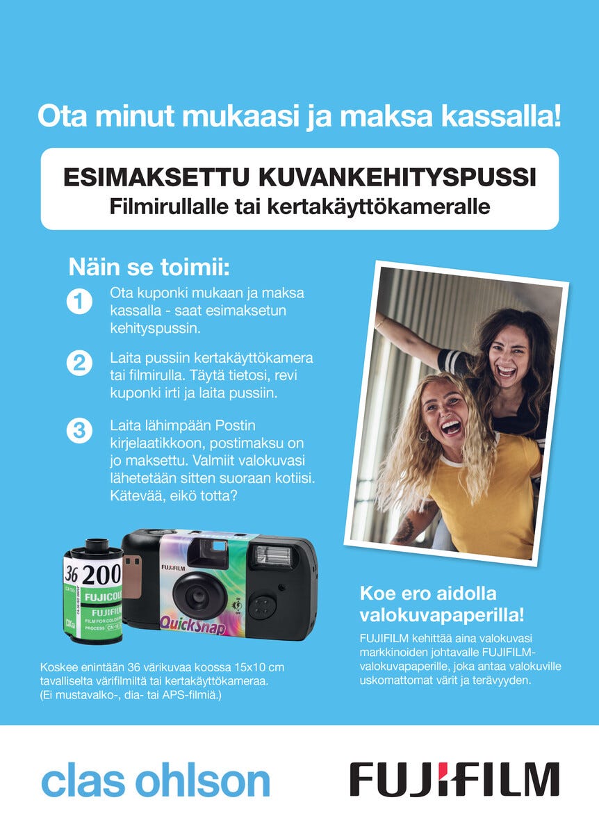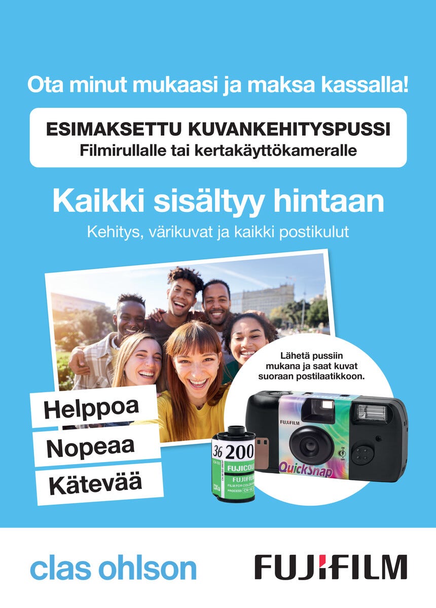 • Lähetä filmirulla tai kertakäyttökamera ja saa valmiit kuvat postitse.