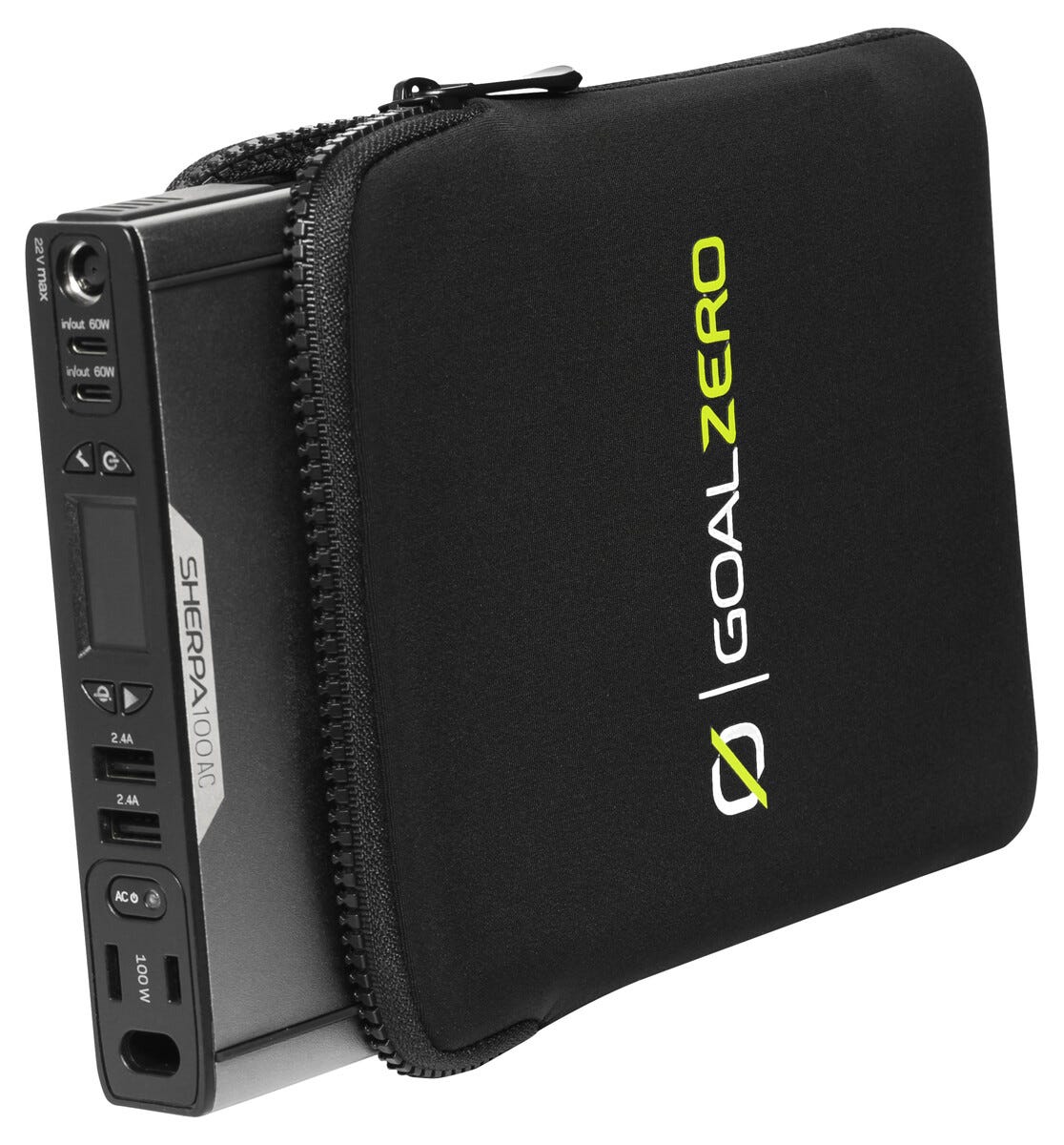 • Goal Zero Sleeve Sherpa 100AC – mittojen mukaan tehty tekstiilikotelo, jossa on vetoketju.