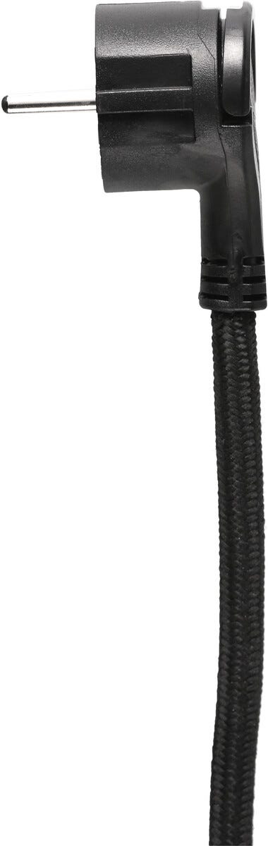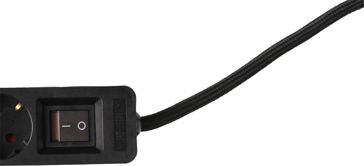 • Maadoitettu jatkojohto, jossa 3 vinoa pistorasiaa ja kangaspäällysteinen johto.