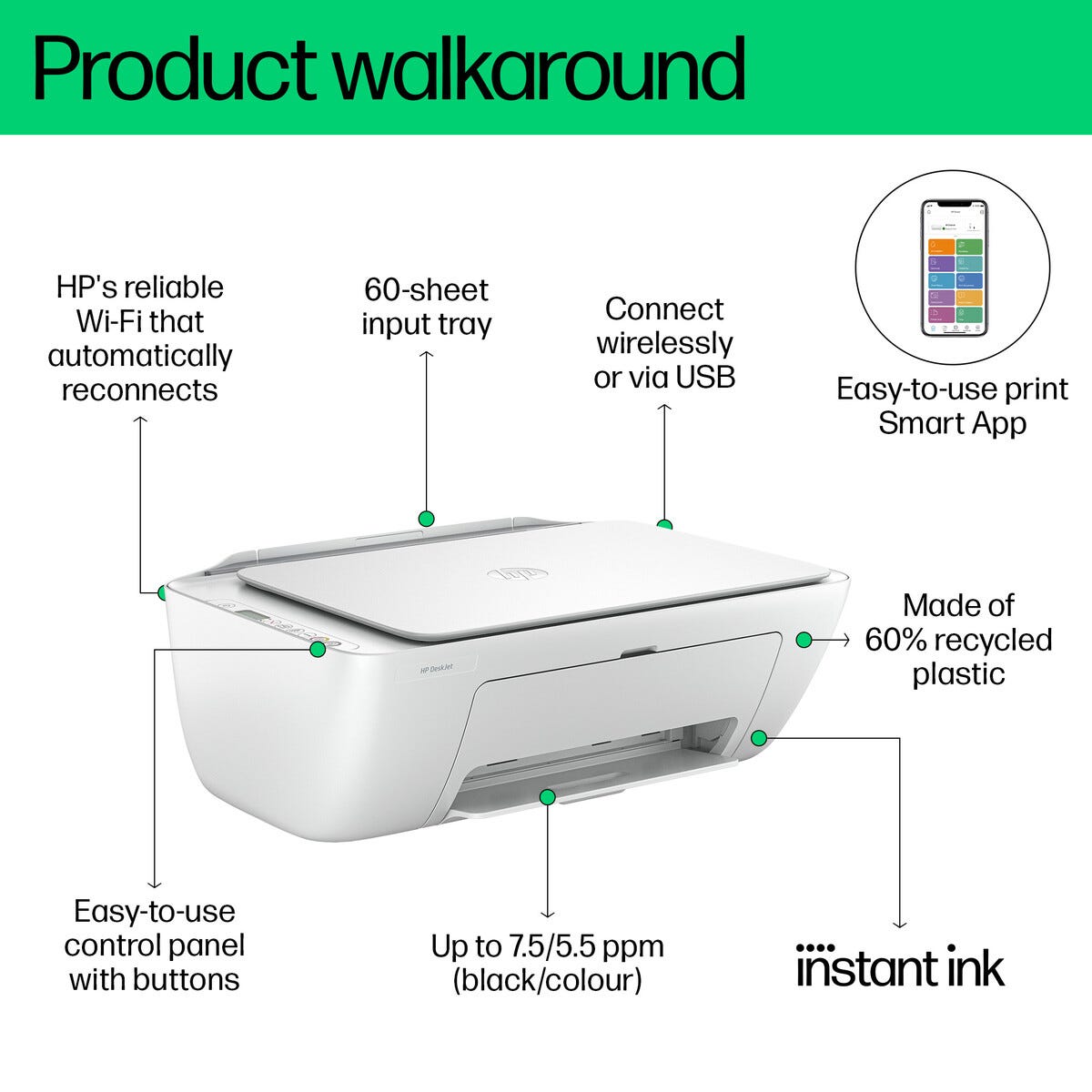 • HP DeskJet 2810e -väritulostin, jossa skannaustoiminto – 60 % uusiomuovia.