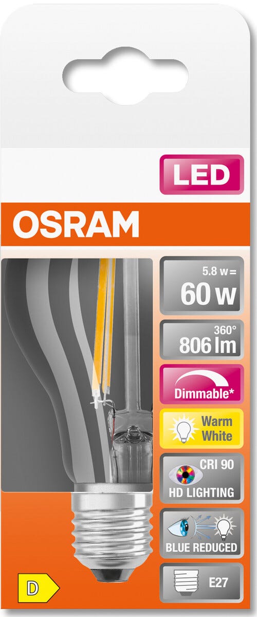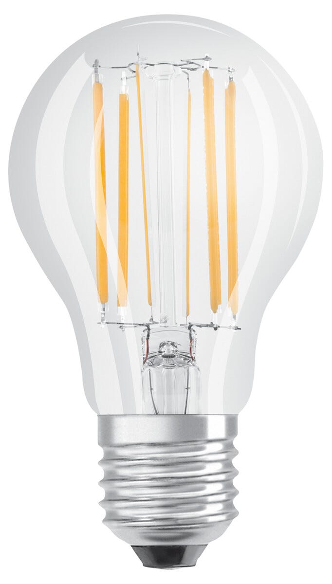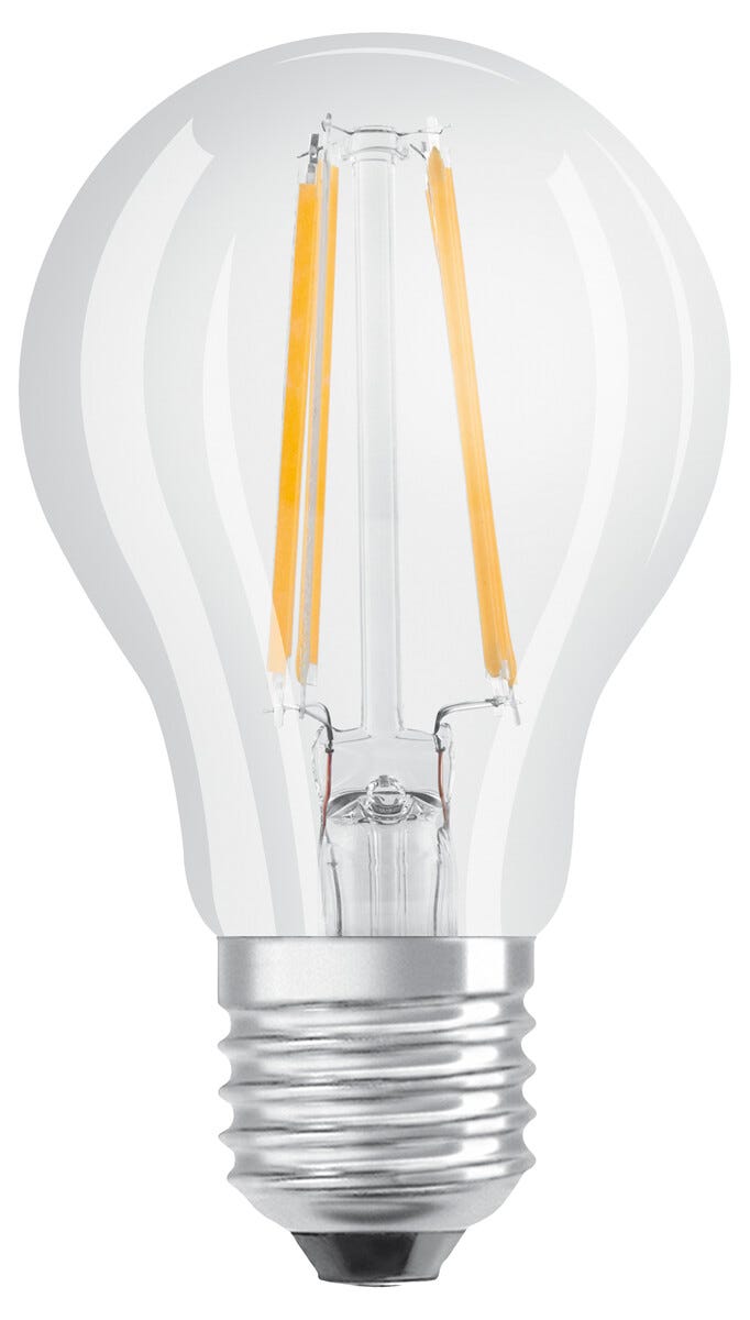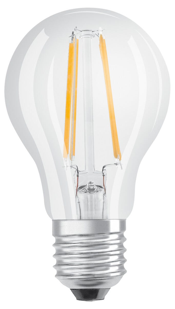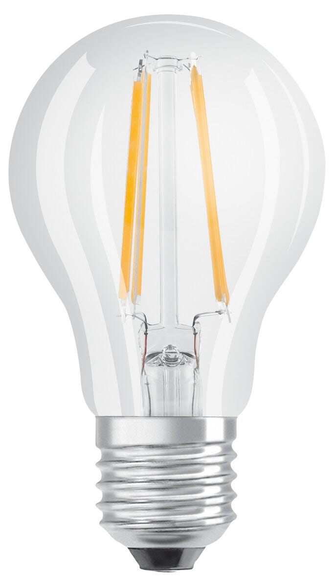 • Lämpimän valkoinen, normaalikokoinen, kirkasta lasia, näkyvä LED-filamentti.