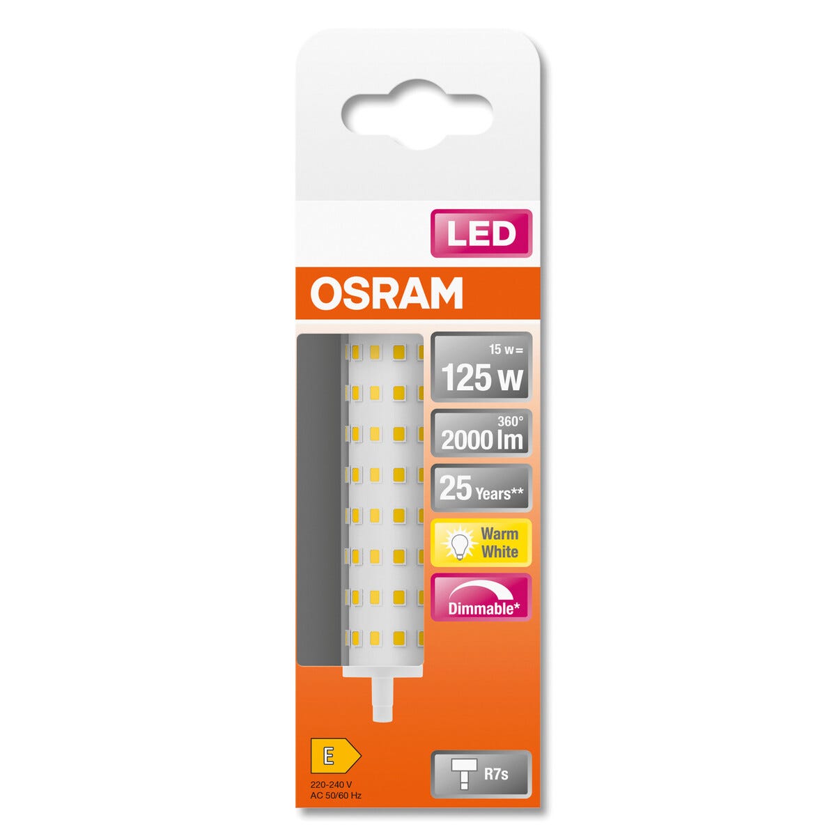 • 2000 luumenia. Lämpimän valkoinen (2700 K). Mitat: 118 x 29 mm.