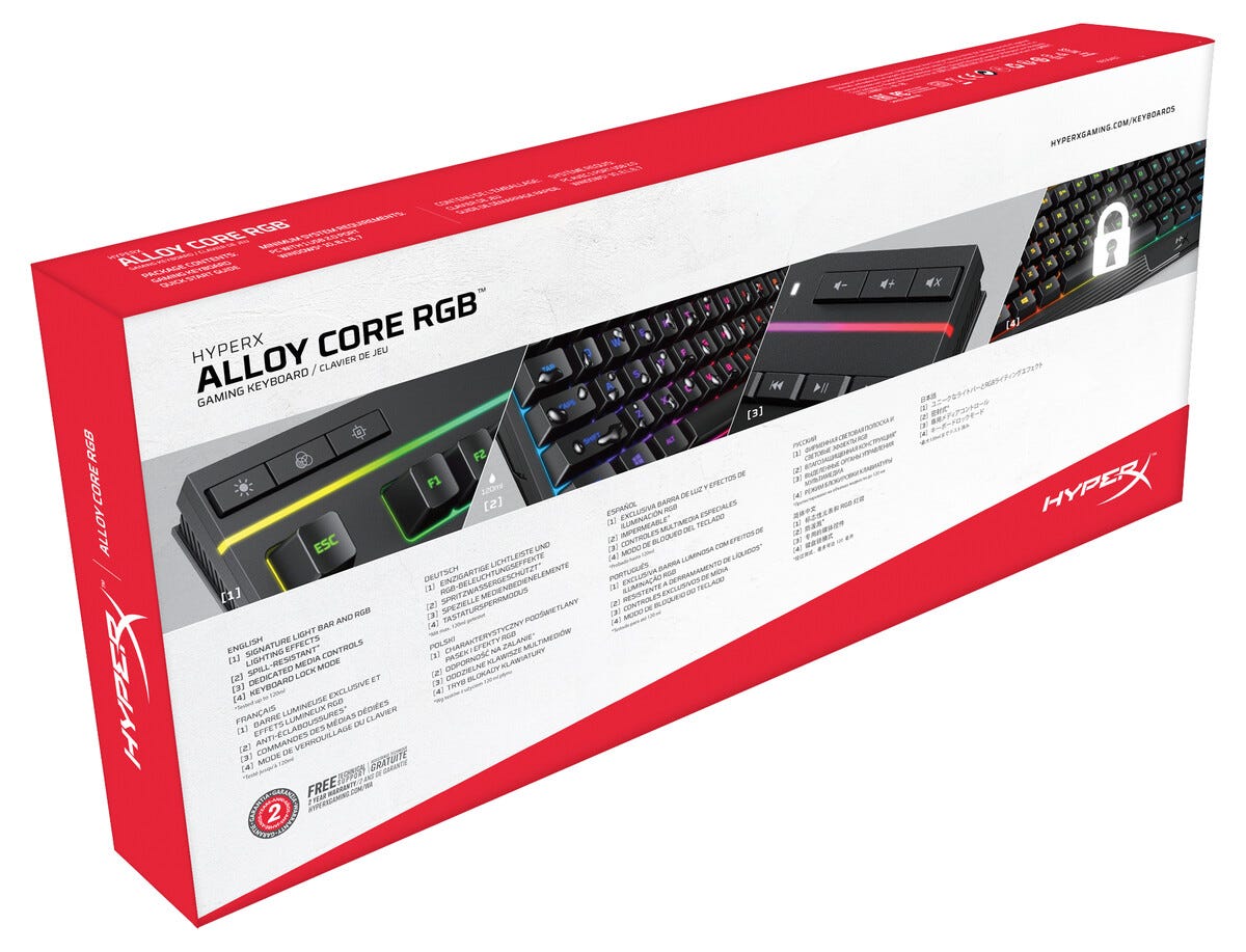 • HyperX Alloy Core RGB pelinäppäimistö, jossa näyttävä RGB-valaistus.