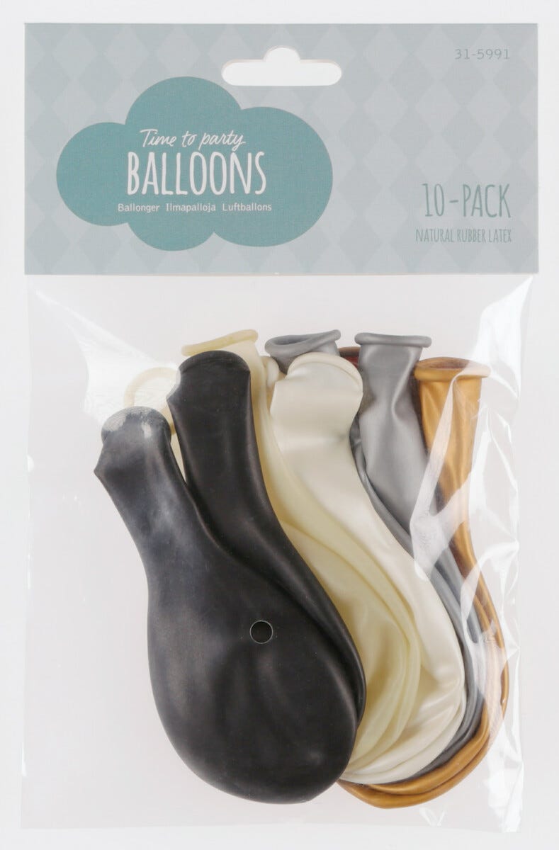 • Pakkauksessa on 10 ilmapalloa, sävyinä hopea, kulta, musta, valkoinen ja läpikuultava.