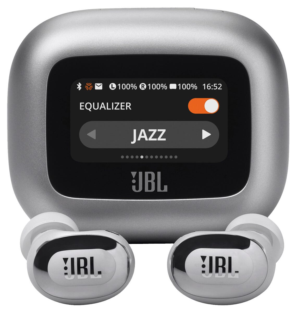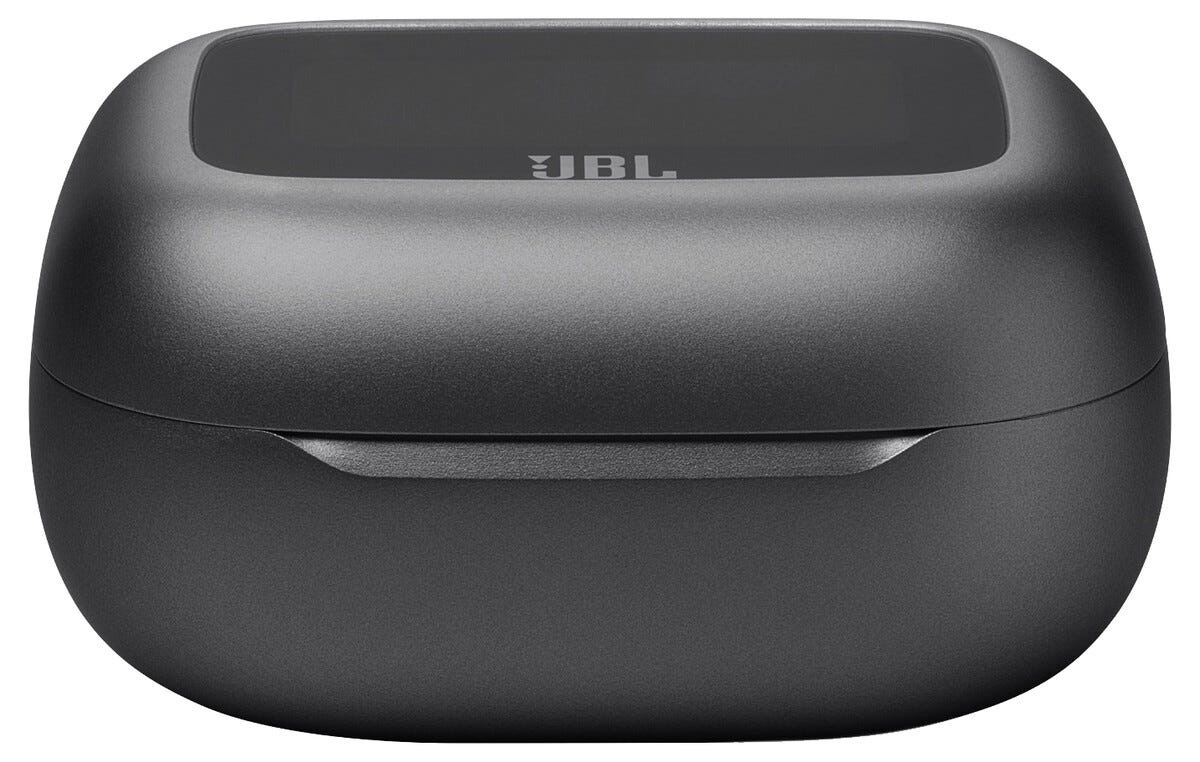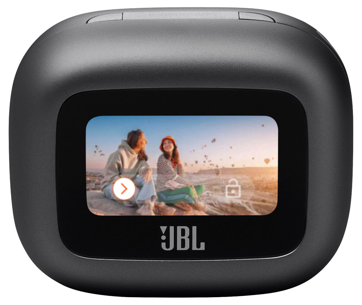 • JBL Live Buds 3 -nappikuulokkeet + Smart Charging Case, jossa näyttö ja ohjaimet.