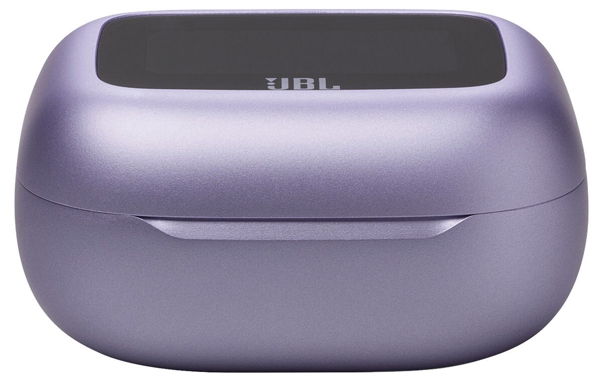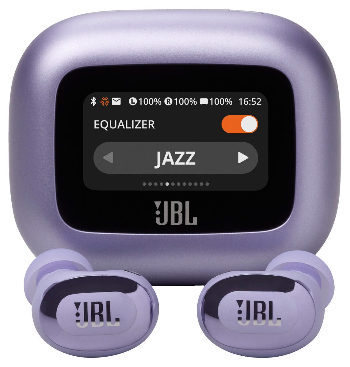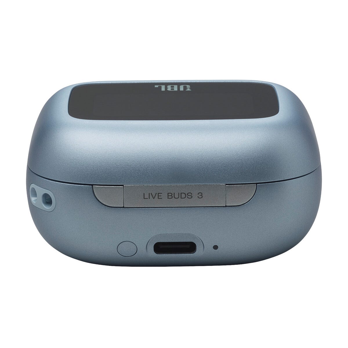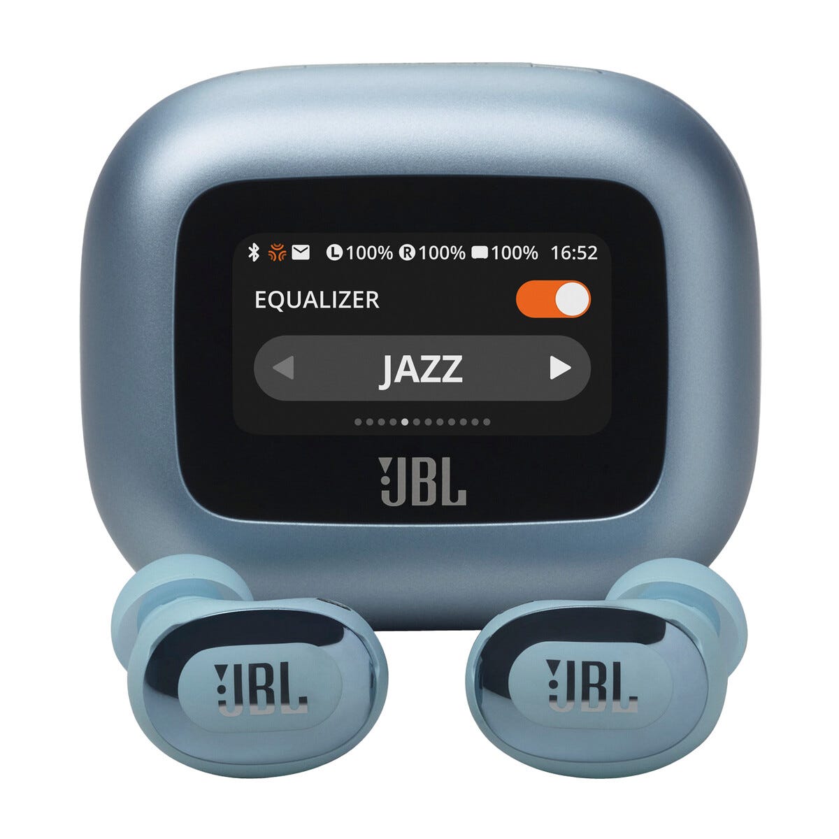 • JBL Live Buds 3 -nappikuulokkeet + Smart Charging Case, jossa näyttö ja ohjaimet.