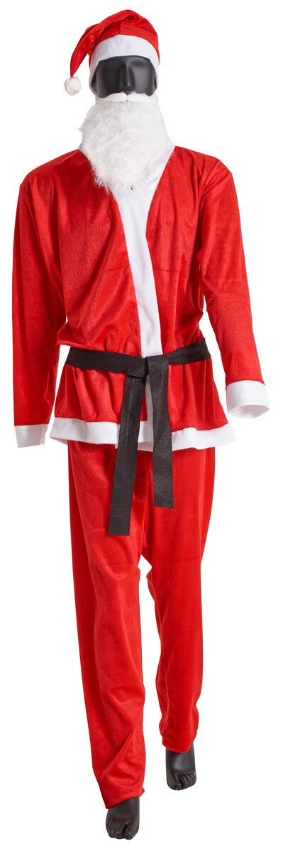• Täydellinen asu, jossa 5 osaa – takki, housut, lakki, vyö ja pukinparta.