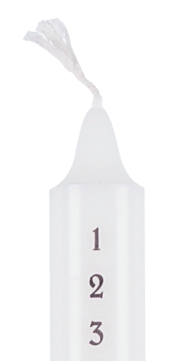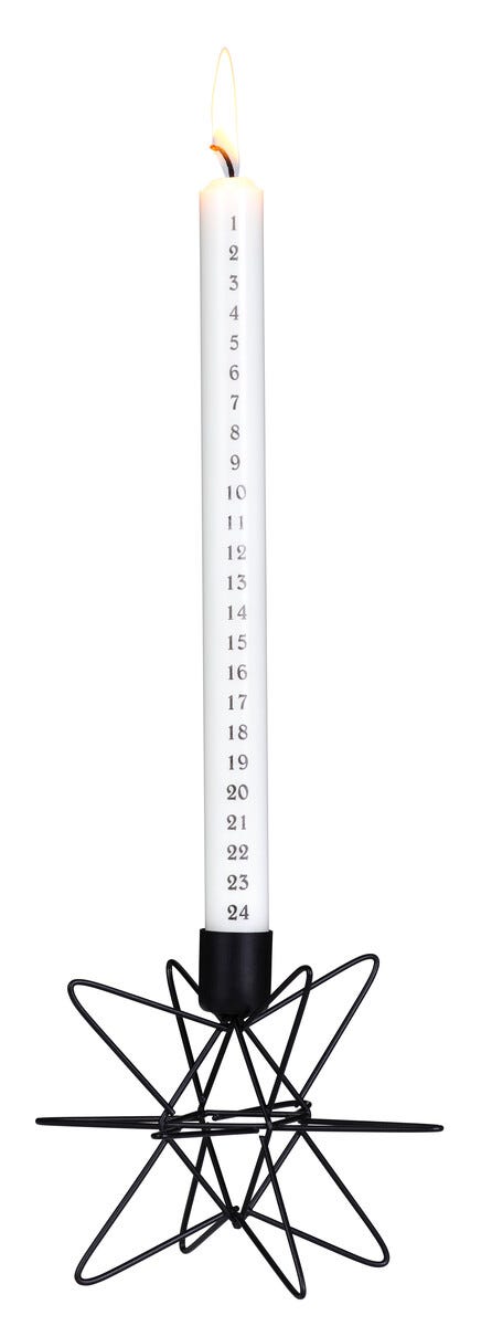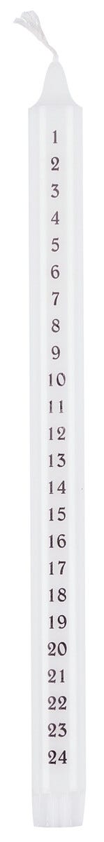 • Valkoinen kynttilä, jossa mustat numerot 1–24. Korkeus 29 cm. Paloaika noin 10,5 tuntia.