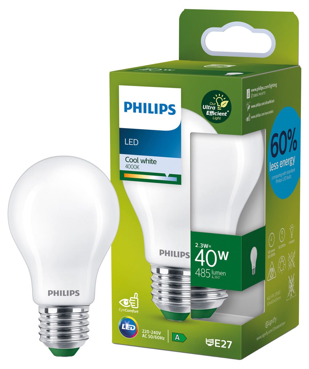 Philips Ultra Efficient E27 A60 2,3 W LED-lamppu, kylmän valkoinen