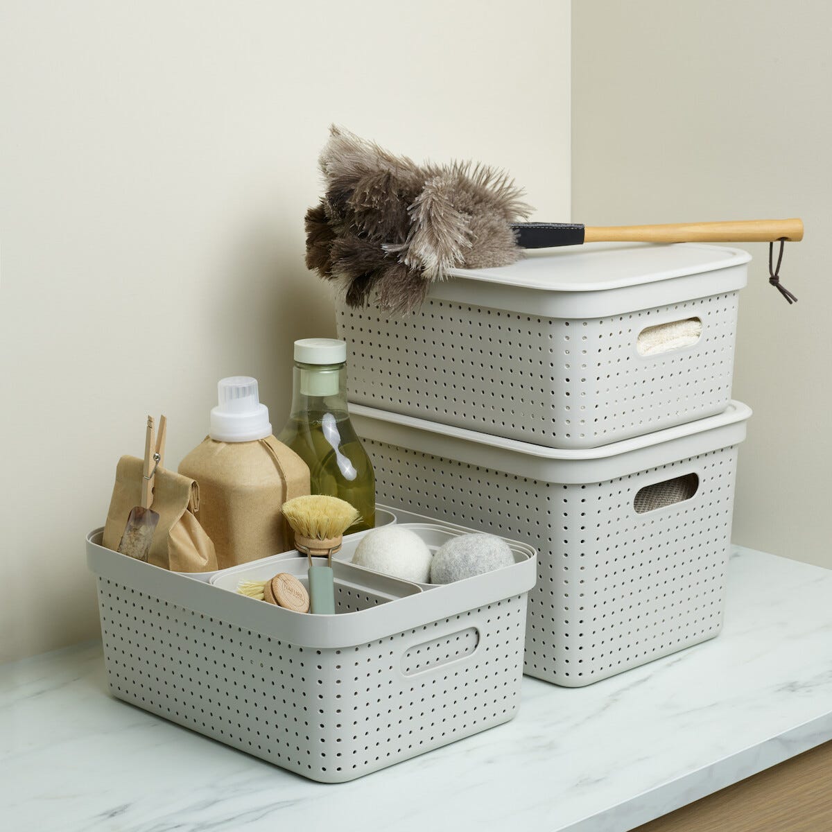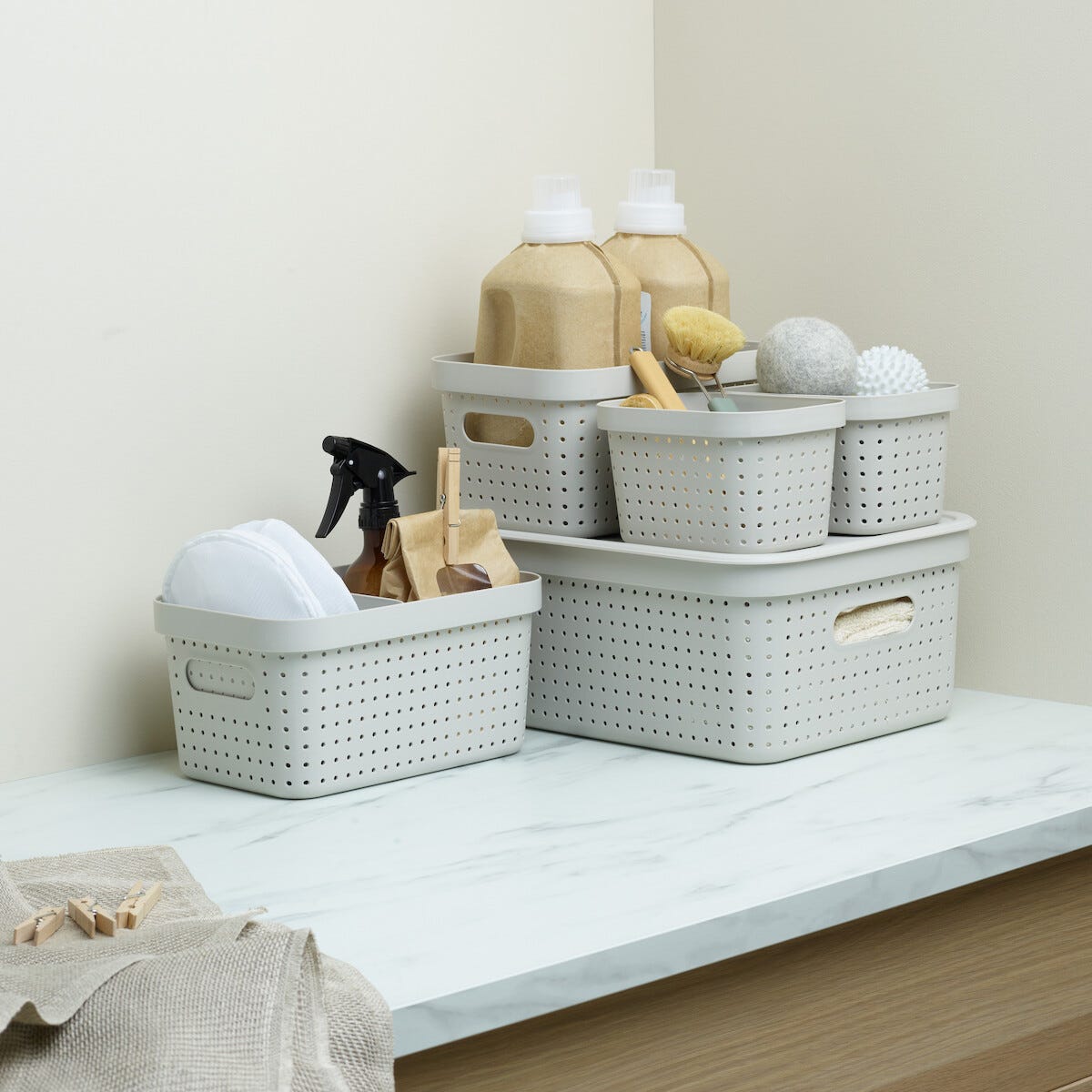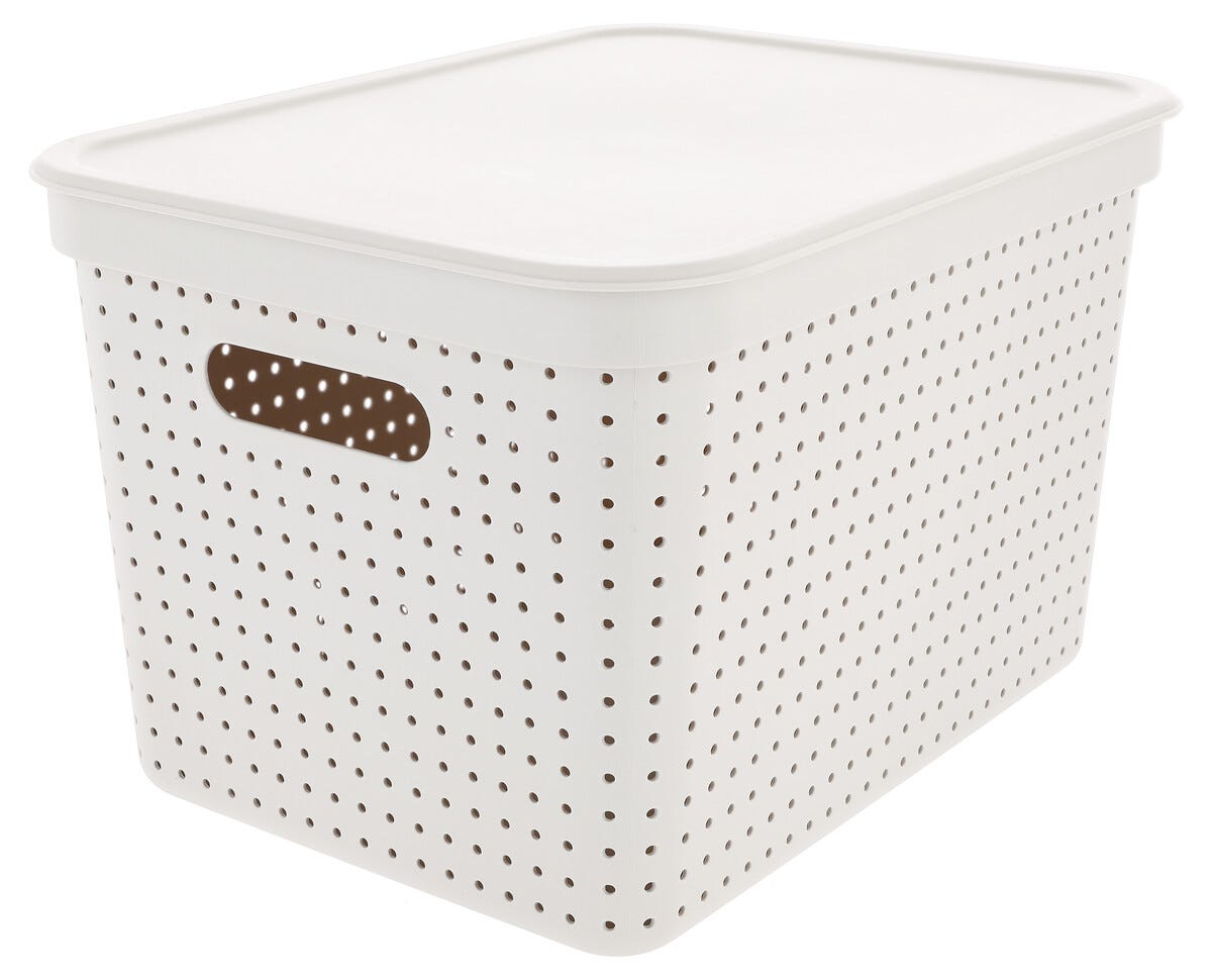 • Muovikansi uusiomuovista valmistettuihin säilytyskoreihin, koot M ja L.