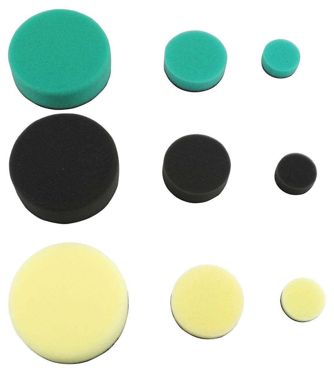 • 3 x vihreä, 3 x keltainen ja 3 x musta, halkaisijat 25, 50 ja 75 mm.