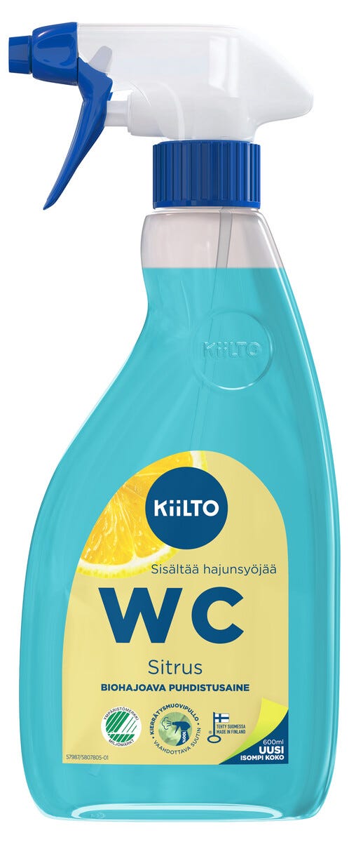 • Kiilto-WC-puhdistusaine ja ilmanpuhdistaja – jättää jälkeensä puhtaan ja raikkaan tuoksun.