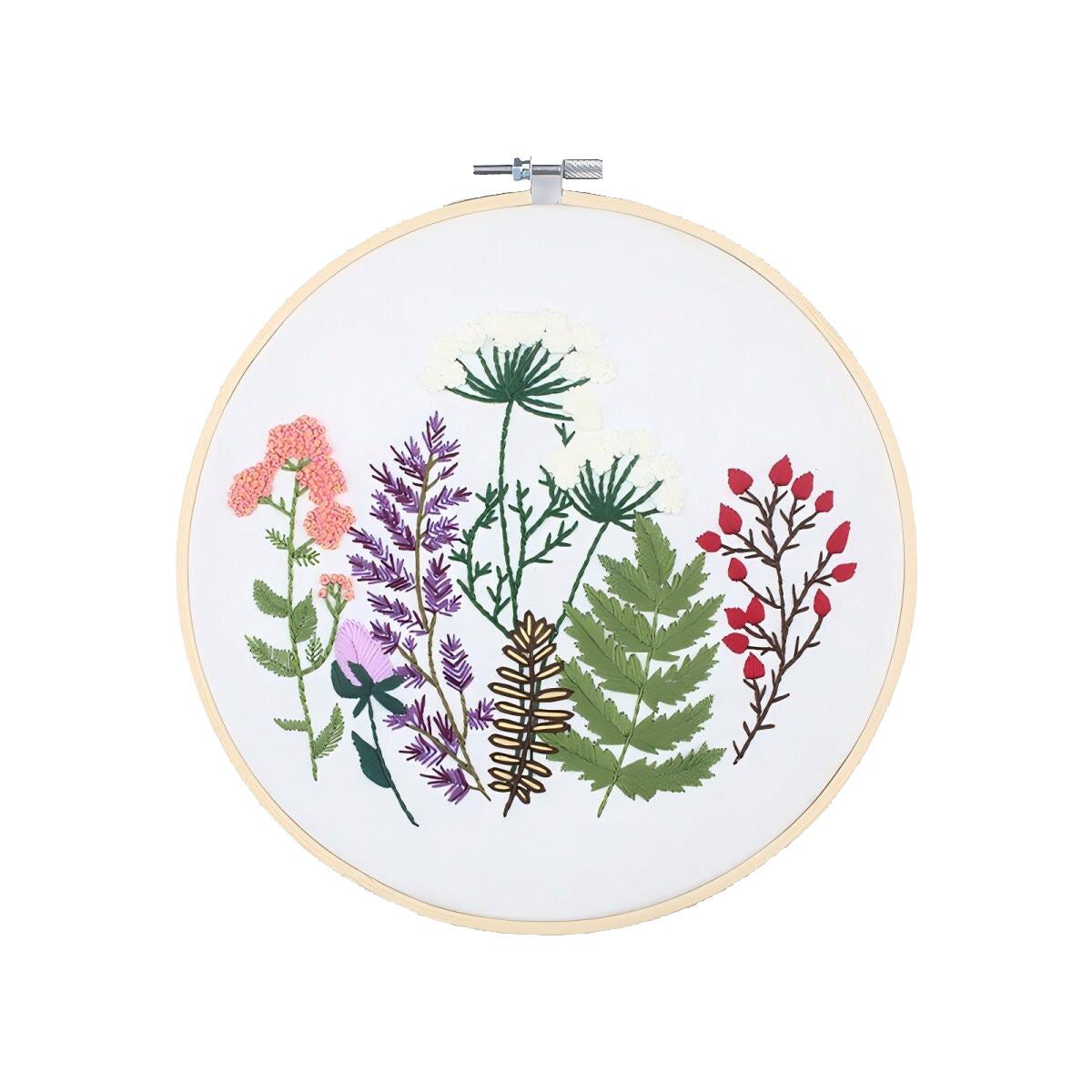 • Opi kirjomaan – kaunis kirjontatyö, jossa on metsäkukkia ja vihreää lehvästöä.
