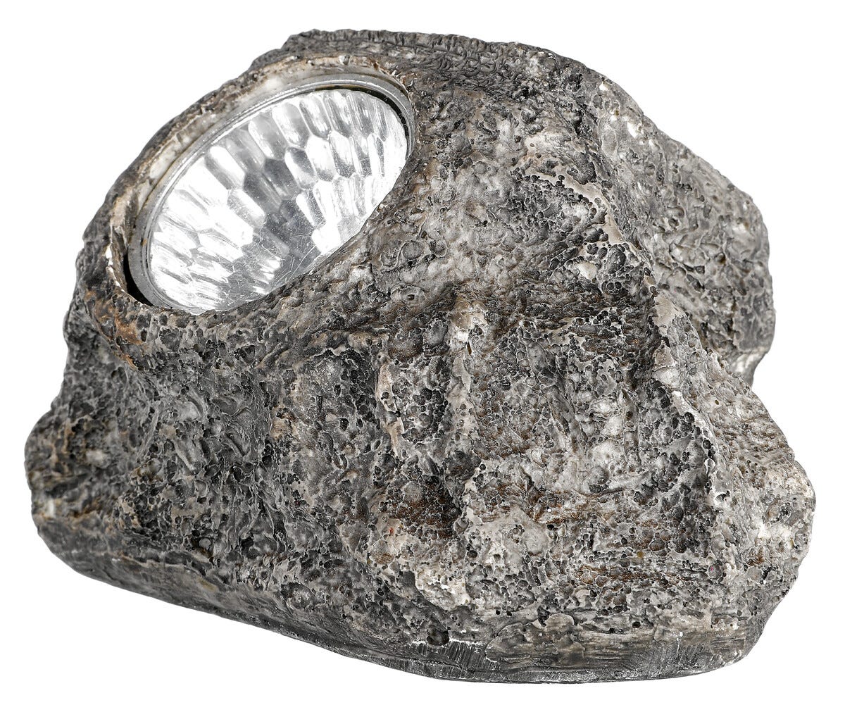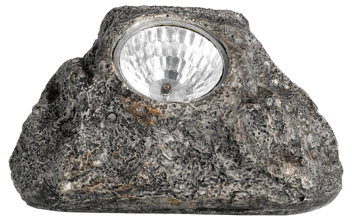 • Solcellslampa med formen av en sten – sprider ett dekorativt sken i trädgården.