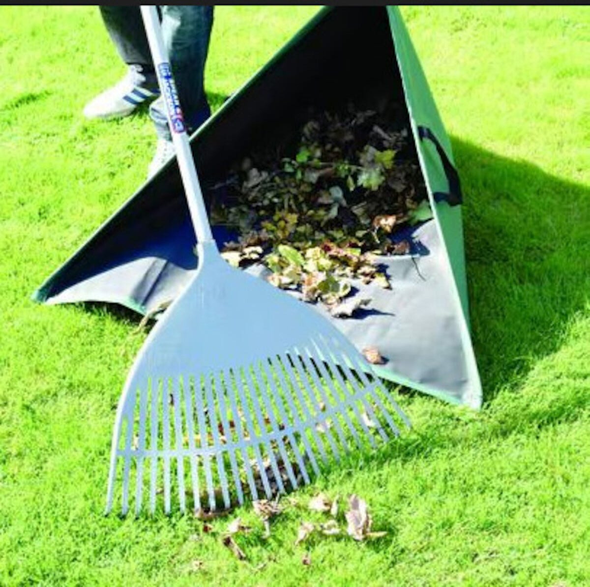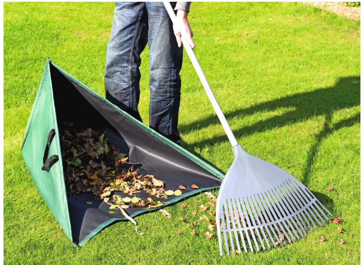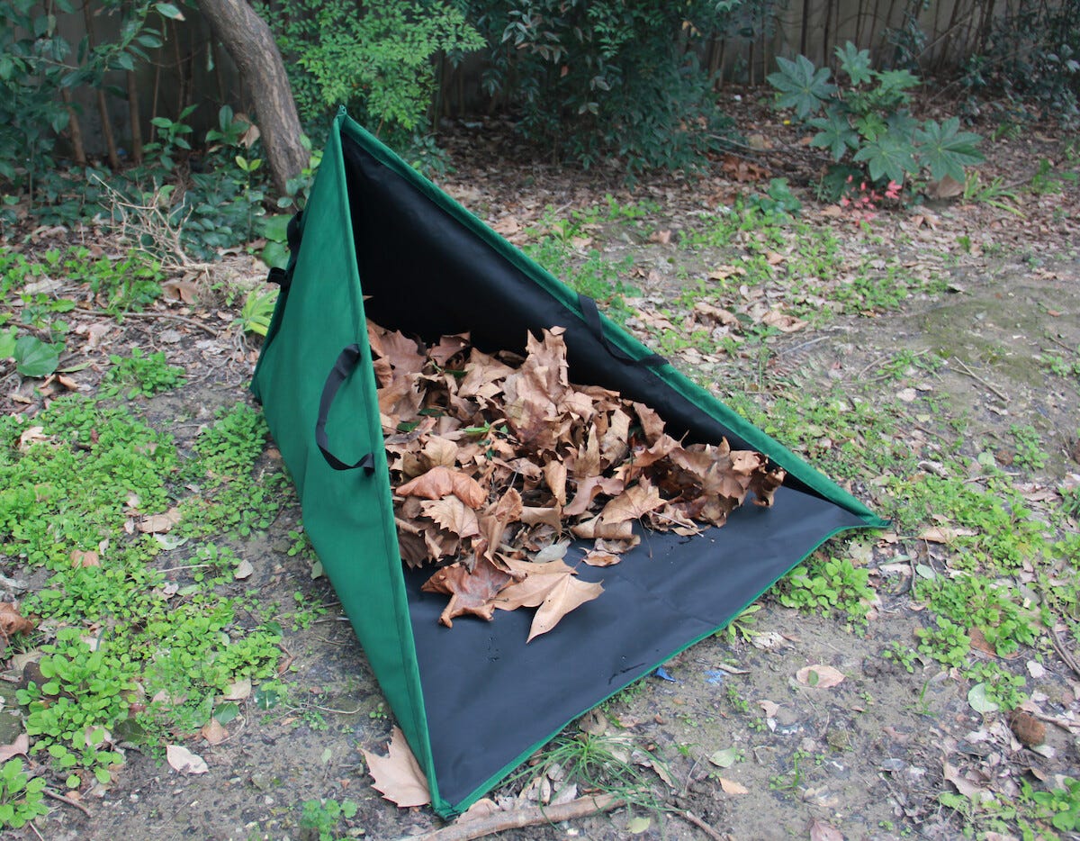 • Kokoontaitettava lehtisäkki, jossa tasainen alaosa – helpompi kasata lehdet.