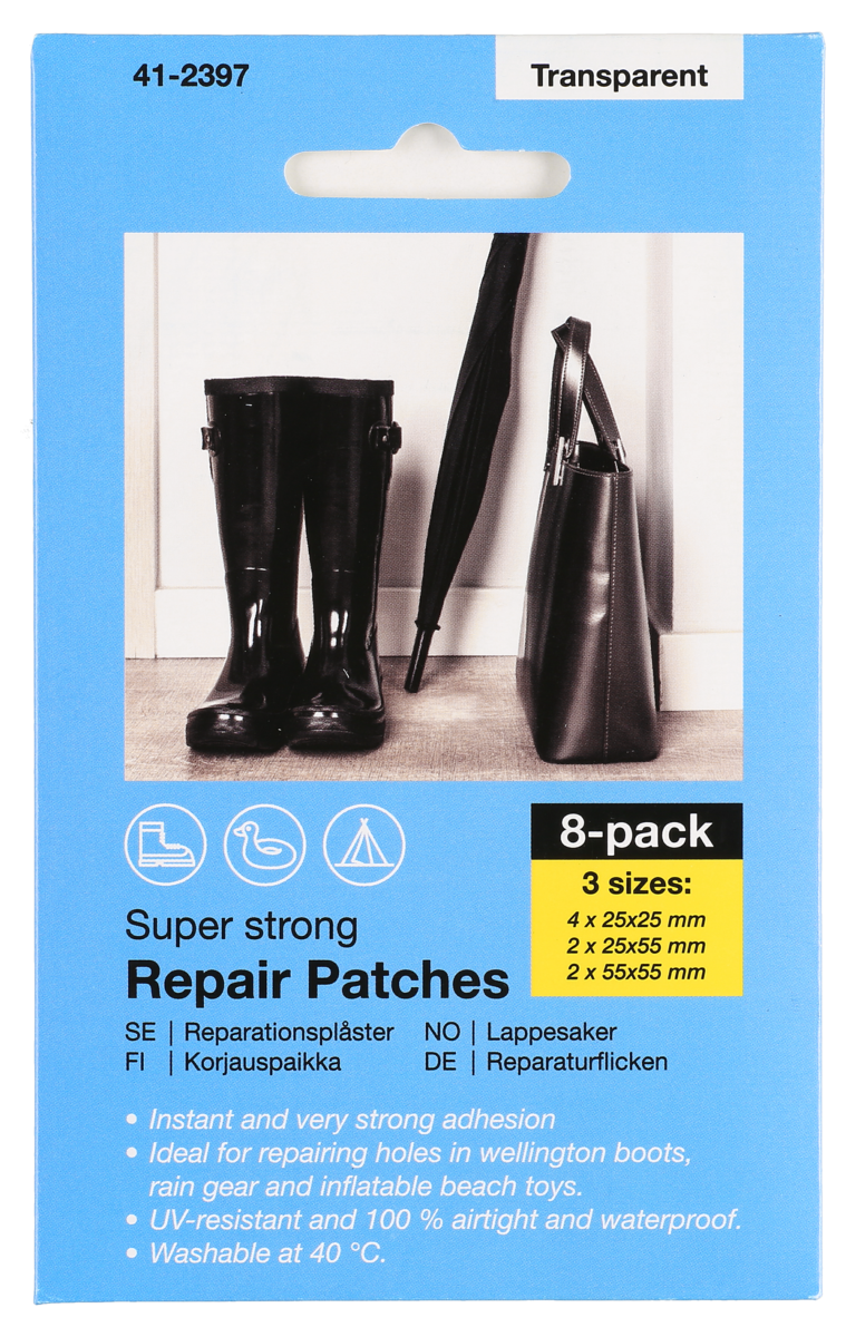 • Pakkauksessa on läpinäkyviä korjauslappuja – kiinnittyvät useimpiin materiaaleihin.