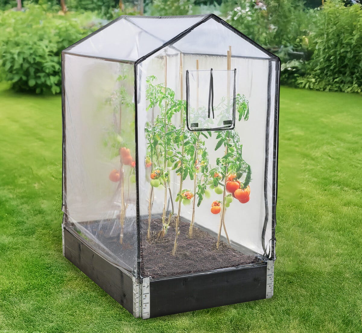 • Vetoketjullinen rullaovi, kaksi avattavaa ikkunaa – hyvä tuuletus ja helppo pääsy hoitamaan kasveja.