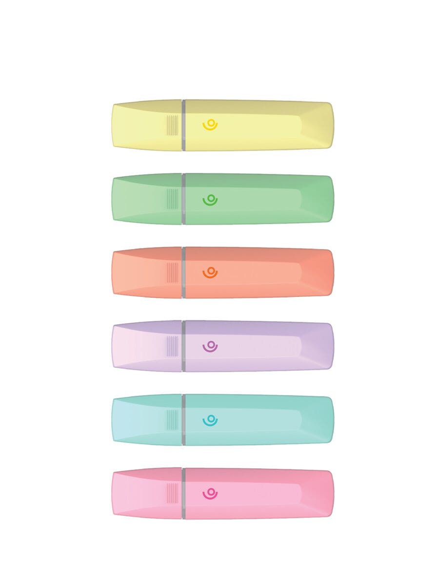 • 6 yliviivaustussia pastelliväreissä.