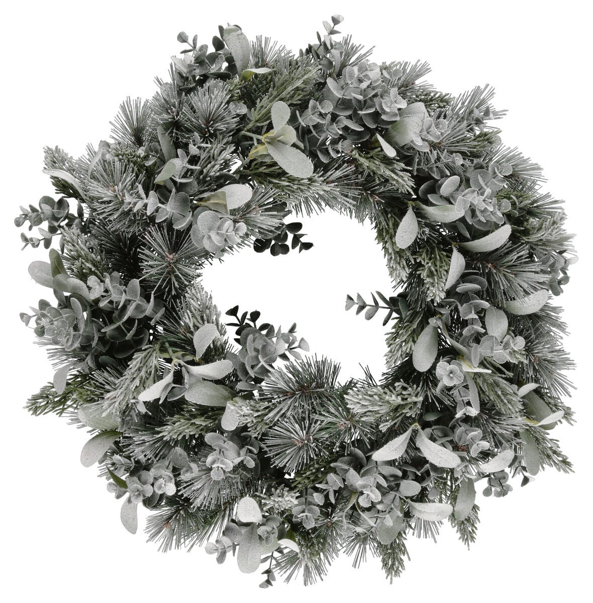 • Suuri keinomateriaaleista valmistettu huurrepintainen kranssi sisäkäyttöön.