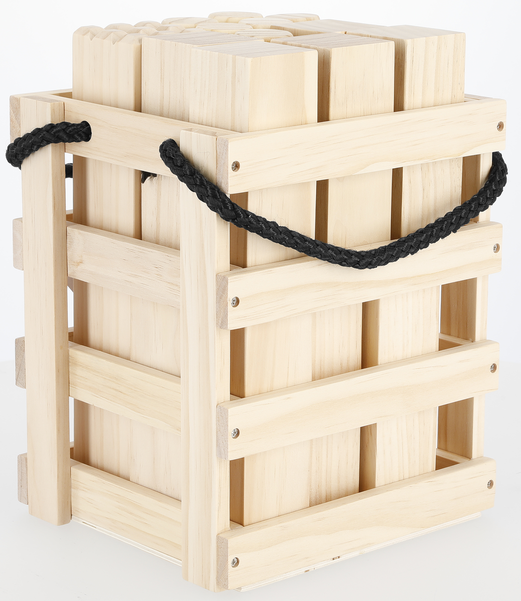 • Kubbspel som förvaras i en trälåda med bärhandtag.