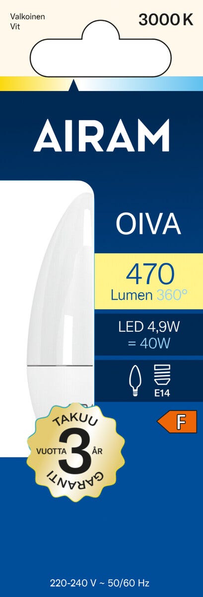 • Airam Oiva LED-kynttilälamppu E14, opaalinvalkoinen lasi.