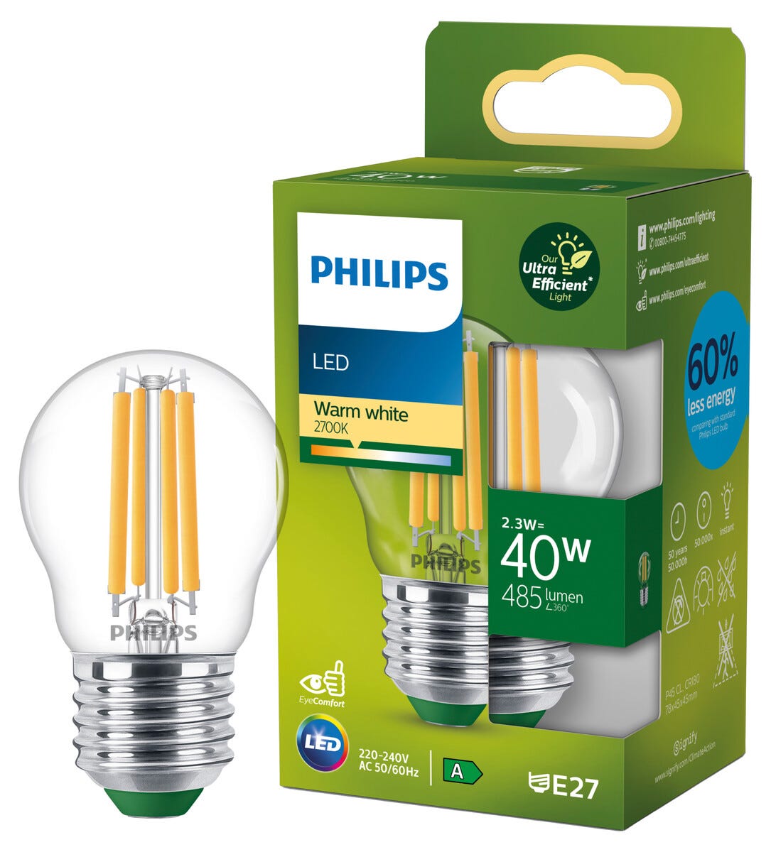 LED Lamppu Philips Ultra Efficient E27 G45, 2,3 W, lämpimän valkoinen