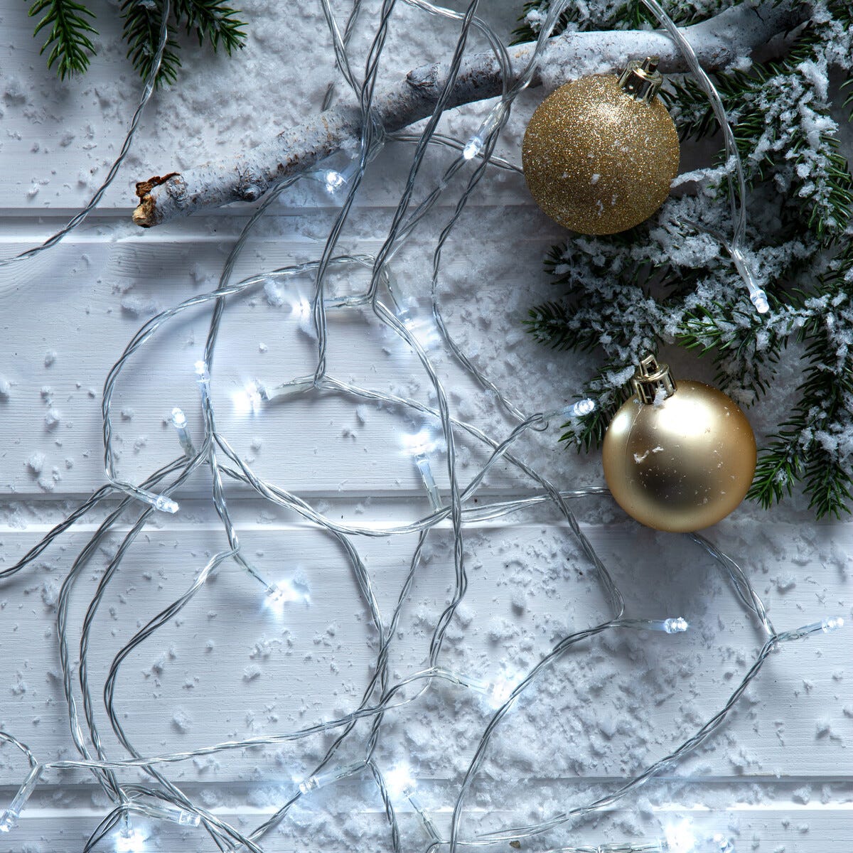 • Valoketju, jossa läpinäkyvä johto ja kylmän valkoiset LED-valot (11 000 K).