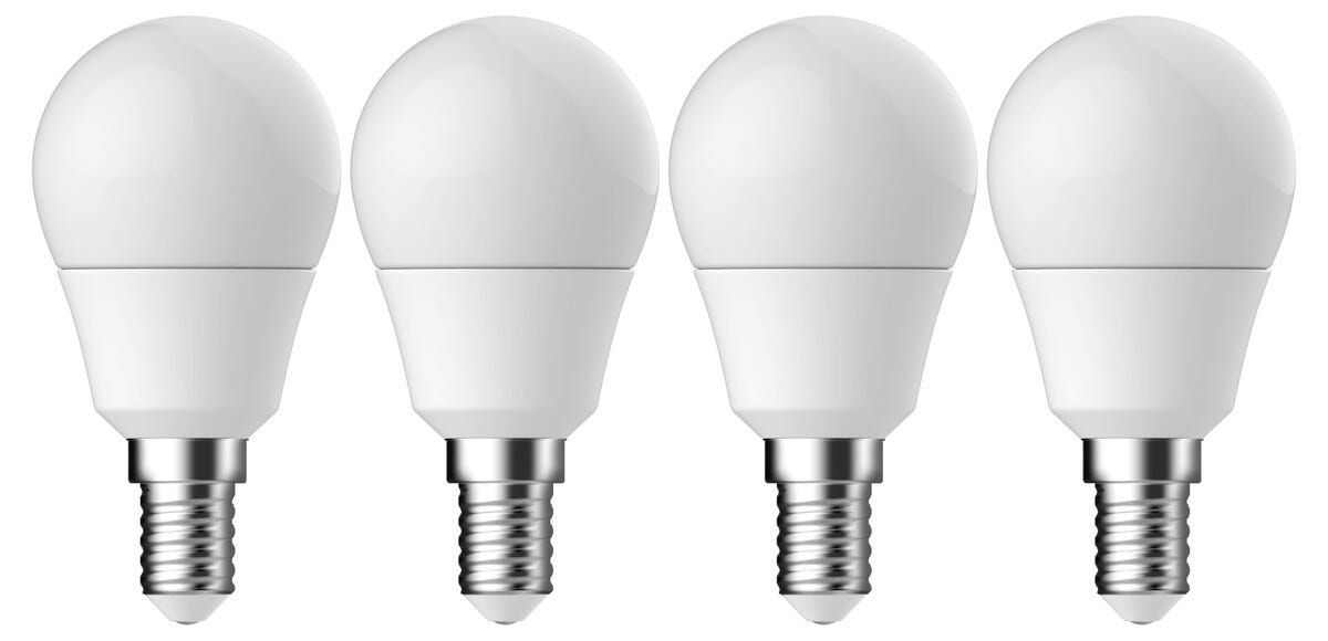 • Lämpimän valkoinen pallopamppu LED E14, jonka huurrettu lasi levittää valon pehmeästi.