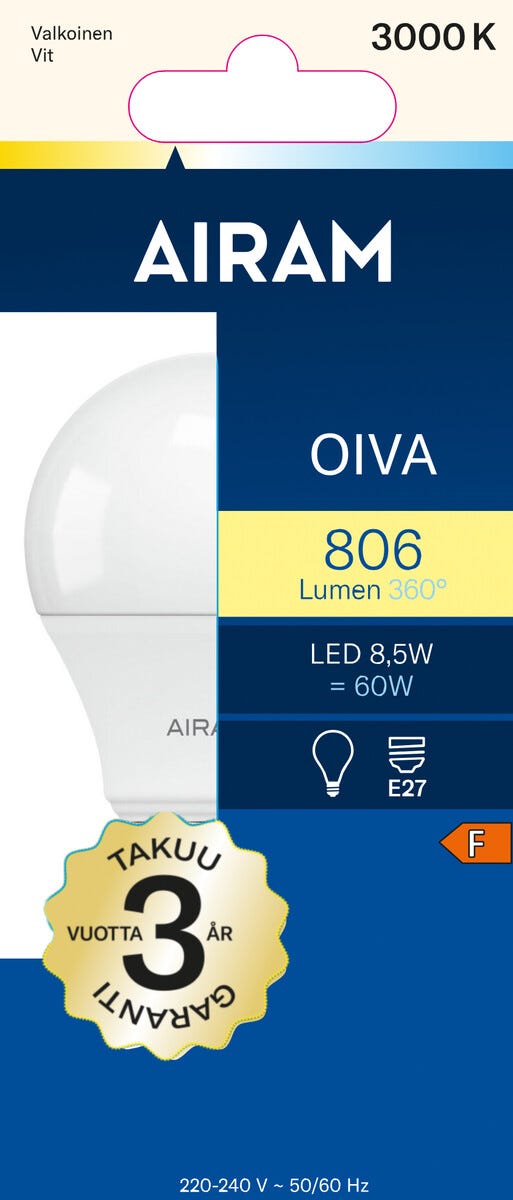 LED-lamppu E27 8,5 W Airam Oiva, lämpimän valkoinen