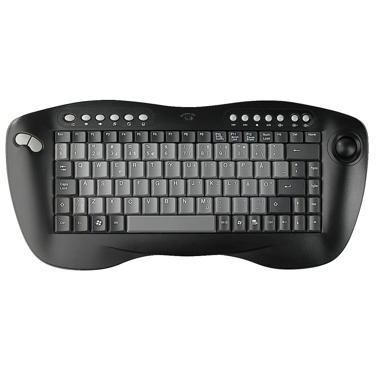 Langaton mininäppäimistö, jossa optinen trackball