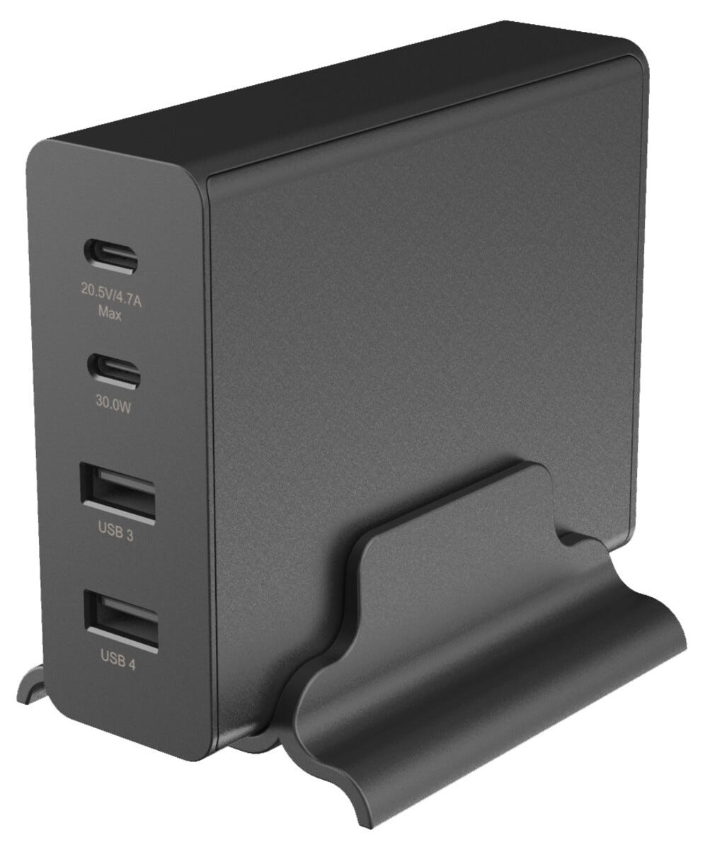 • Tehokas USB-C/A-laturi, jossa on neljä porttia.