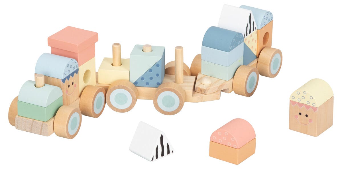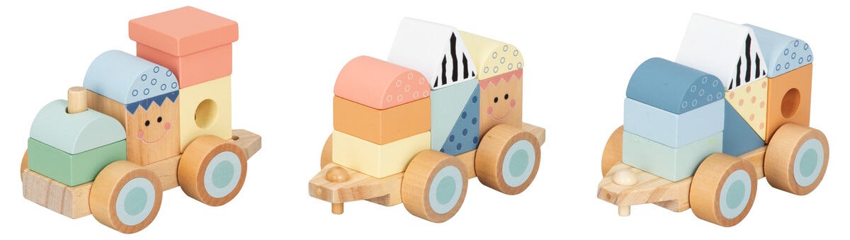 • Juna ja puupalikat – harjoittaa hienomotoriikkaa, värejä ja muotoja.