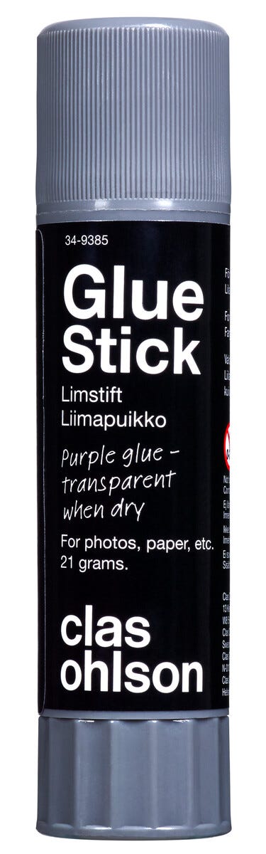 • Näppärä liimapuikko, jonka violetinvärinen liima muuttuu kuivuttuaan läpinäkyväksi.