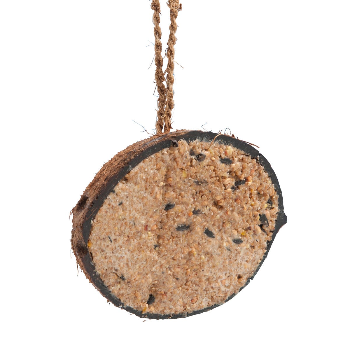 • Linnunsiemenien, talin ja viljan sekoitus kookospähkinän puolikkaassa.